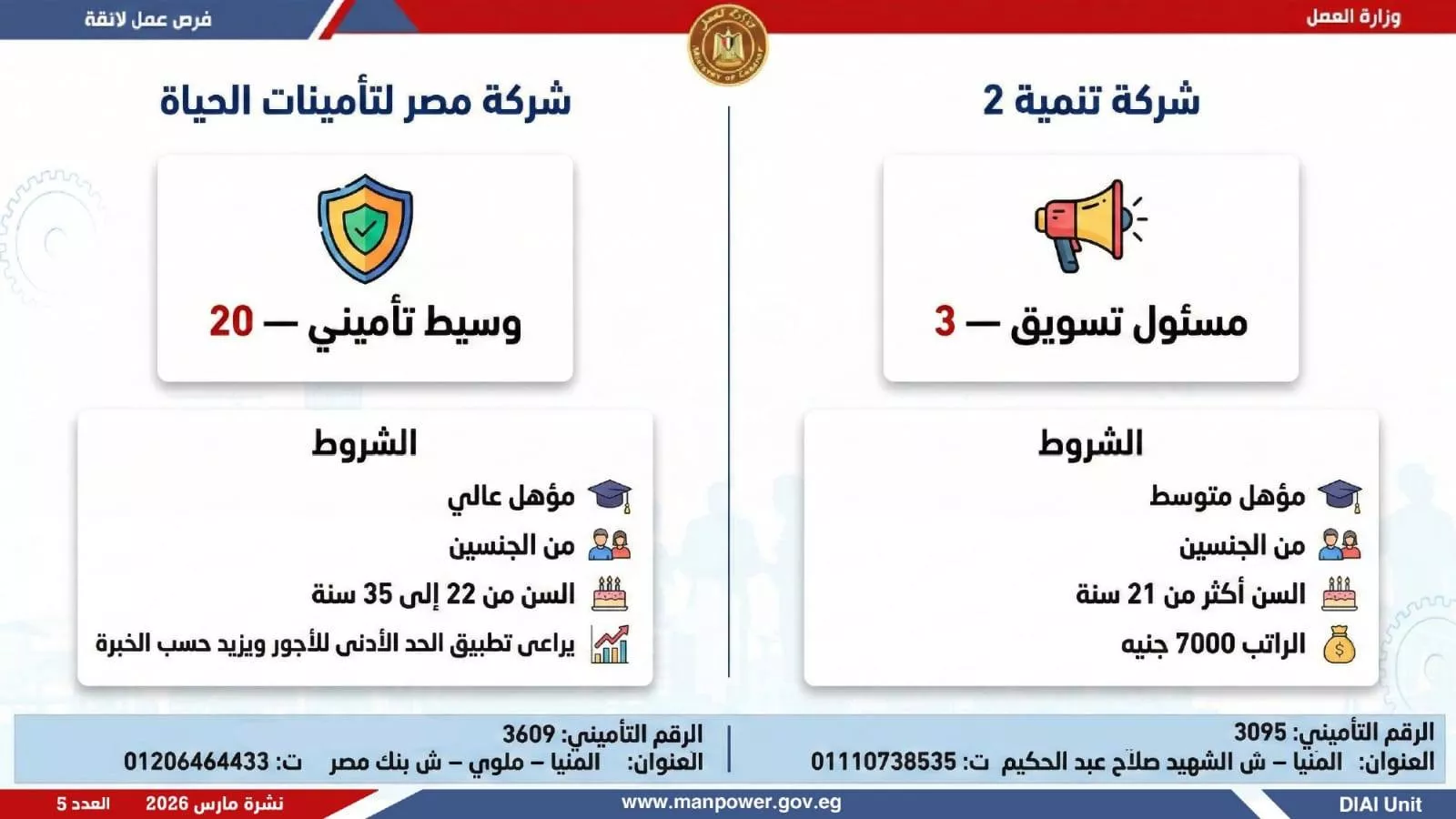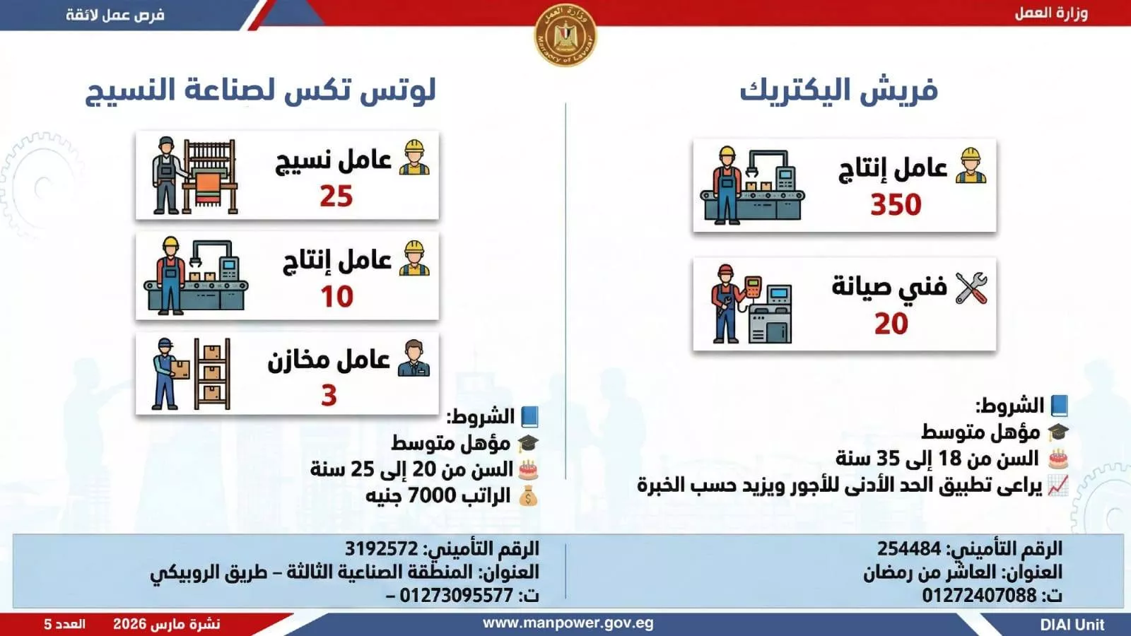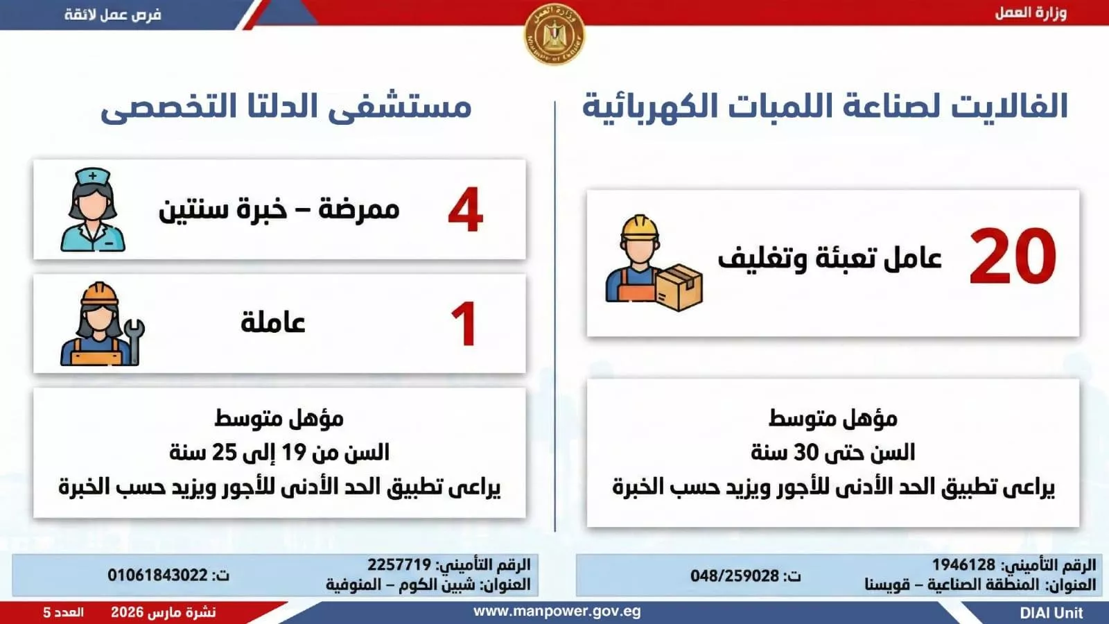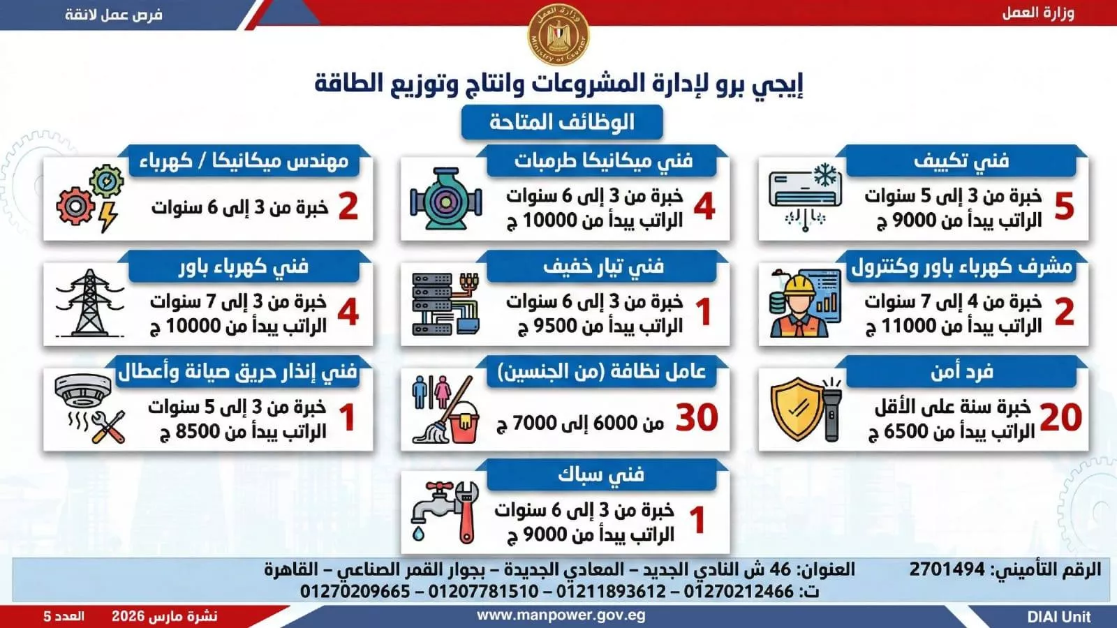 أعلنت وزارة العمل، اليوم الإثنين، عن إطلاق نشرة التوظيف نصف الشهرية متضمنة 5188 فرصة عمل حقيقية بالتعاون مع 60 شركة من شركات القطاع الخاص، موزعة على 11 محافظة، مع فتح باب التقديم خلال شهر مارس 2026، في خطوة تؤكد أن العمل ليس مجرد وظيفة، بل حياة كريمة، واستقرار أسري، ومستقبل يُبنى بيد المصريين.