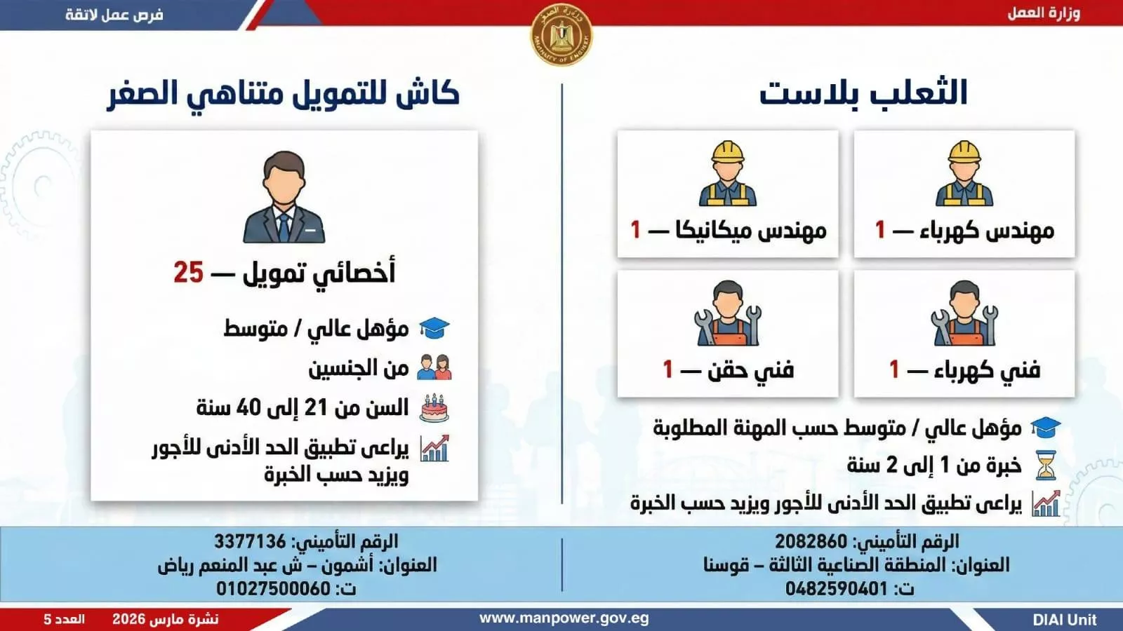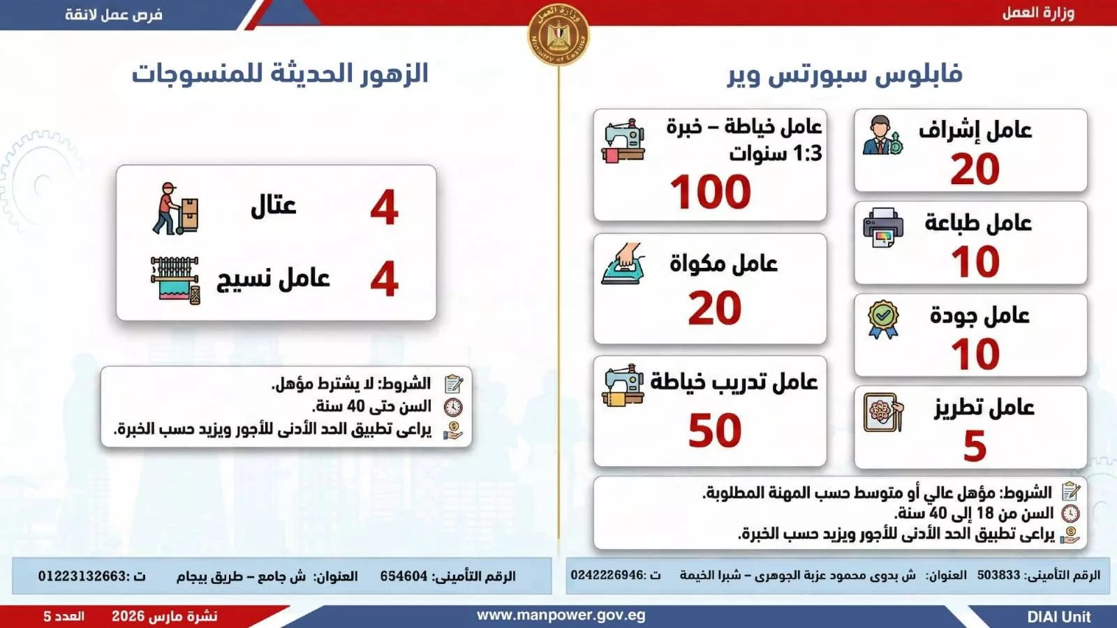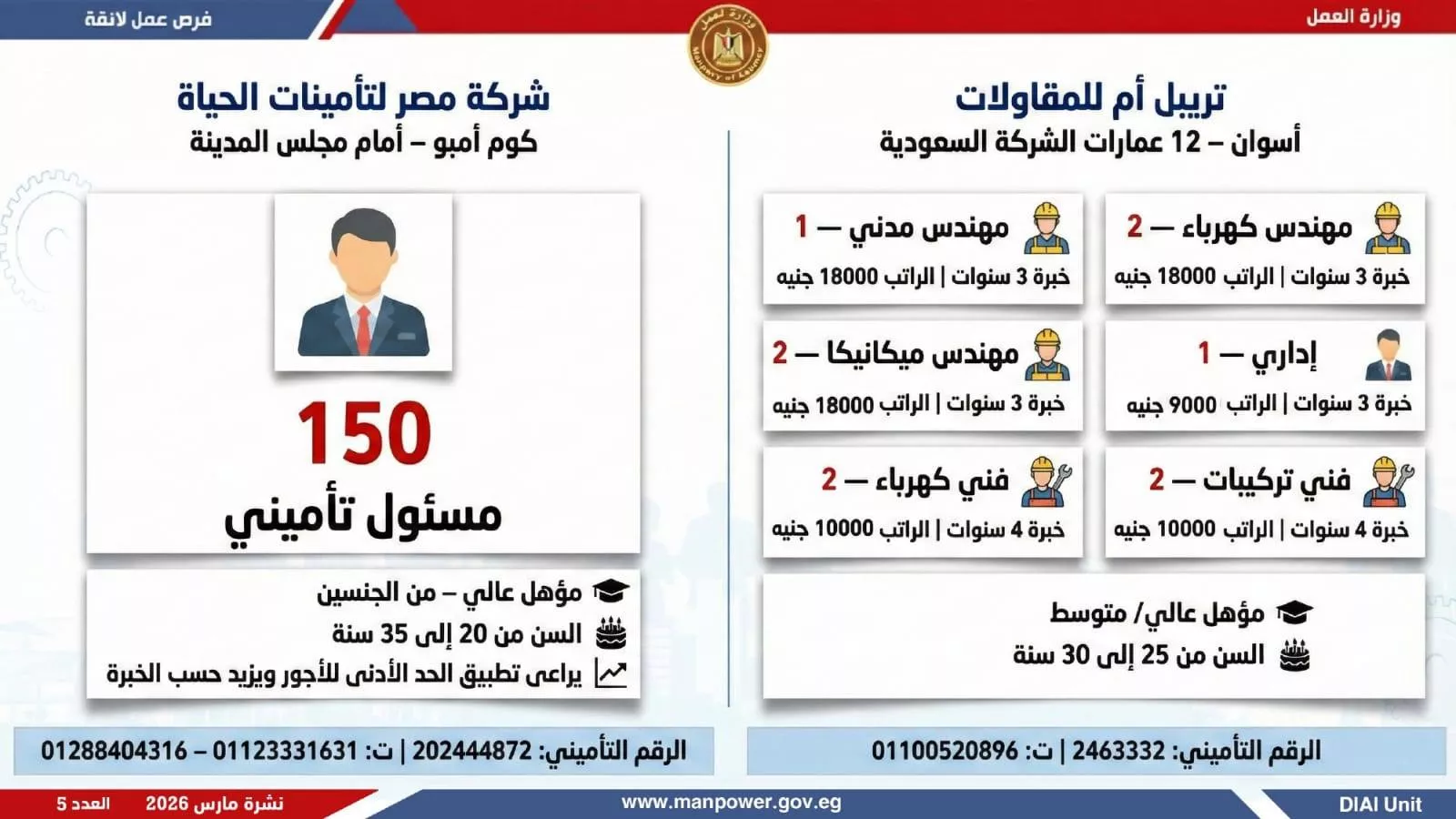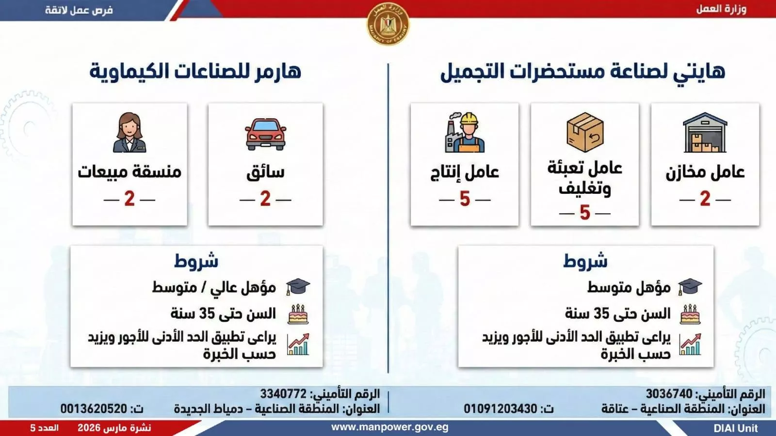 أعلنت وزارة العمل، اليوم الإثنين، عن إطلاق نشرة التوظيف نصف الشهرية متضمنة 5188 فرصة عمل حقيقية بالتعاون مع 60 شركة من شركات القطاع الخاص، موزعة على 11 محافظة، مع فتح باب التقديم خلال شهر مارس 2026، في خطوة تؤكد أن العمل ليس مجرد وظيفة، بل حياة كريمة، واستقرار أسري، ومستقبل يُبنى بيد المصريين.