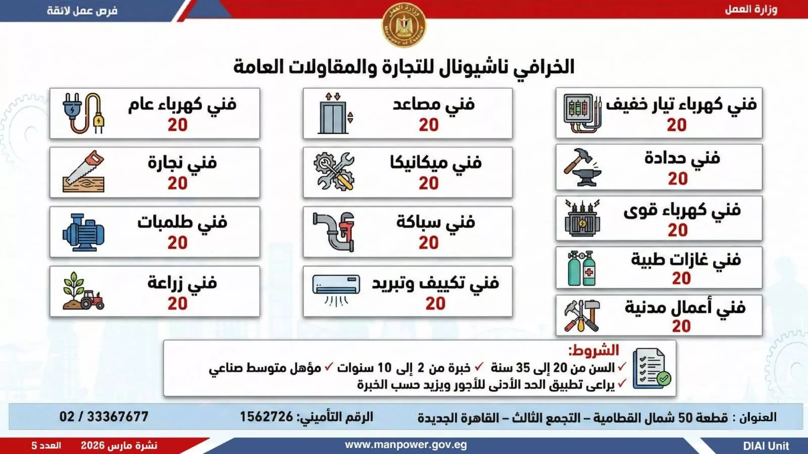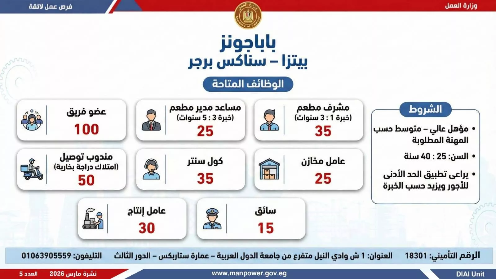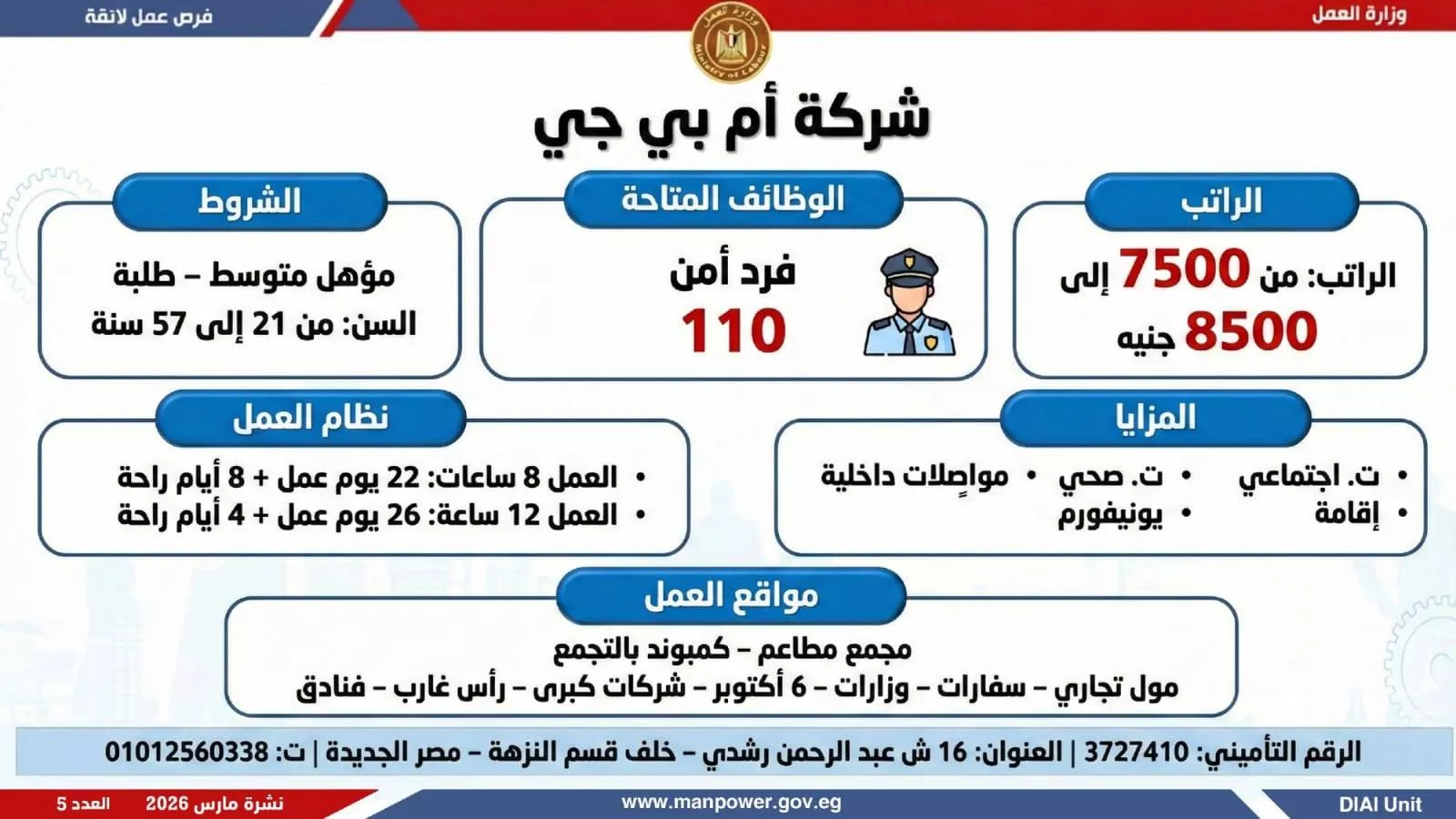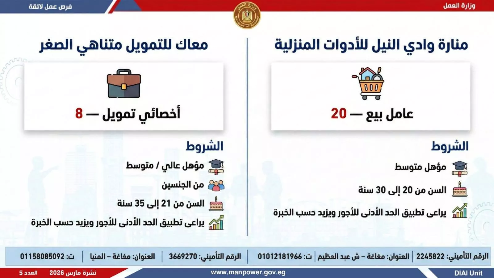أعلنت وزارة العمل، اليوم الإثنين، عن إطلاق نشرة التوظيف نصف الشهرية متضمنة 5188 فرصة عمل حقيقية بالتعاون مع 60 شركة من شركات القطاع الخاص، موزعة على 11 محافظة، مع فتح باب التقديم خلال شهر مارس 2026، في خطوة تؤكد أن العمل ليس مجرد وظيفة، بل حياة كريمة، واستقرار أسري، ومستقبل يُبنى بيد المصريين.