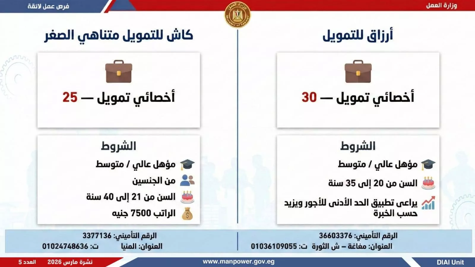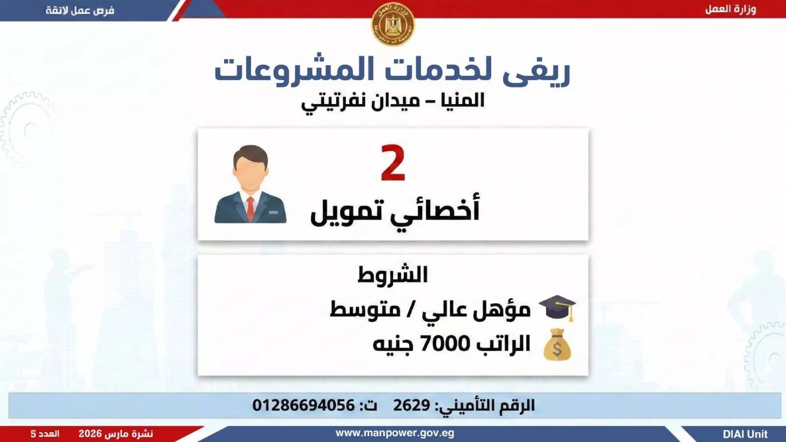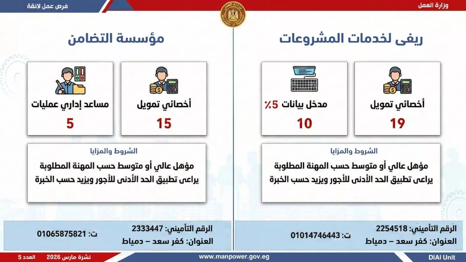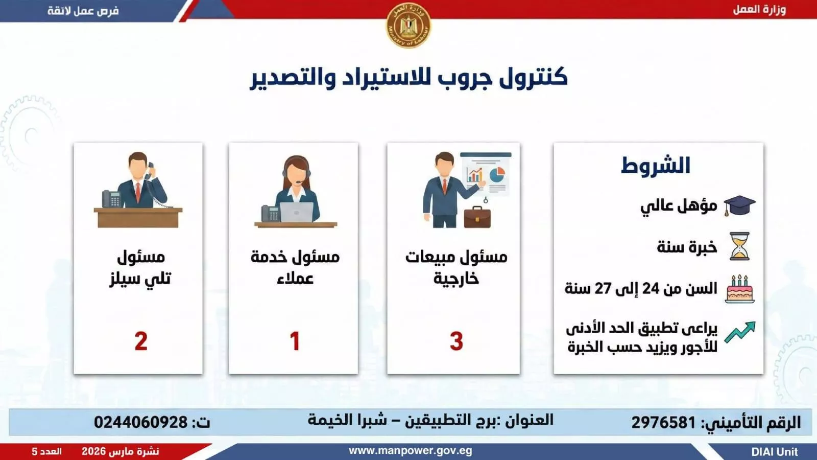 أعلنت وزارة العمل، اليوم الإثنين، عن إطلاق نشرة التوظيف نصف الشهرية متضمنة 5188 فرصة عمل حقيقية بالتعاون مع 60 شركة من شركات القطاع الخاص، موزعة على 11 محافظة، مع فتح باب التقديم خلال شهر مارس 2026، في خطوة تؤكد أن العمل ليس مجرد وظيفة، بل حياة كريمة، واستقرار أسري، ومستقبل يُبنى بيد المصريين.