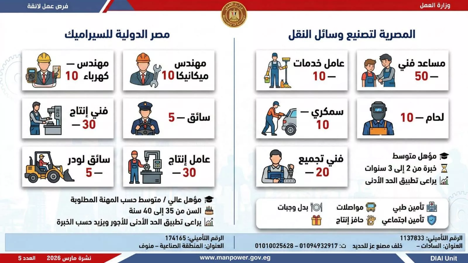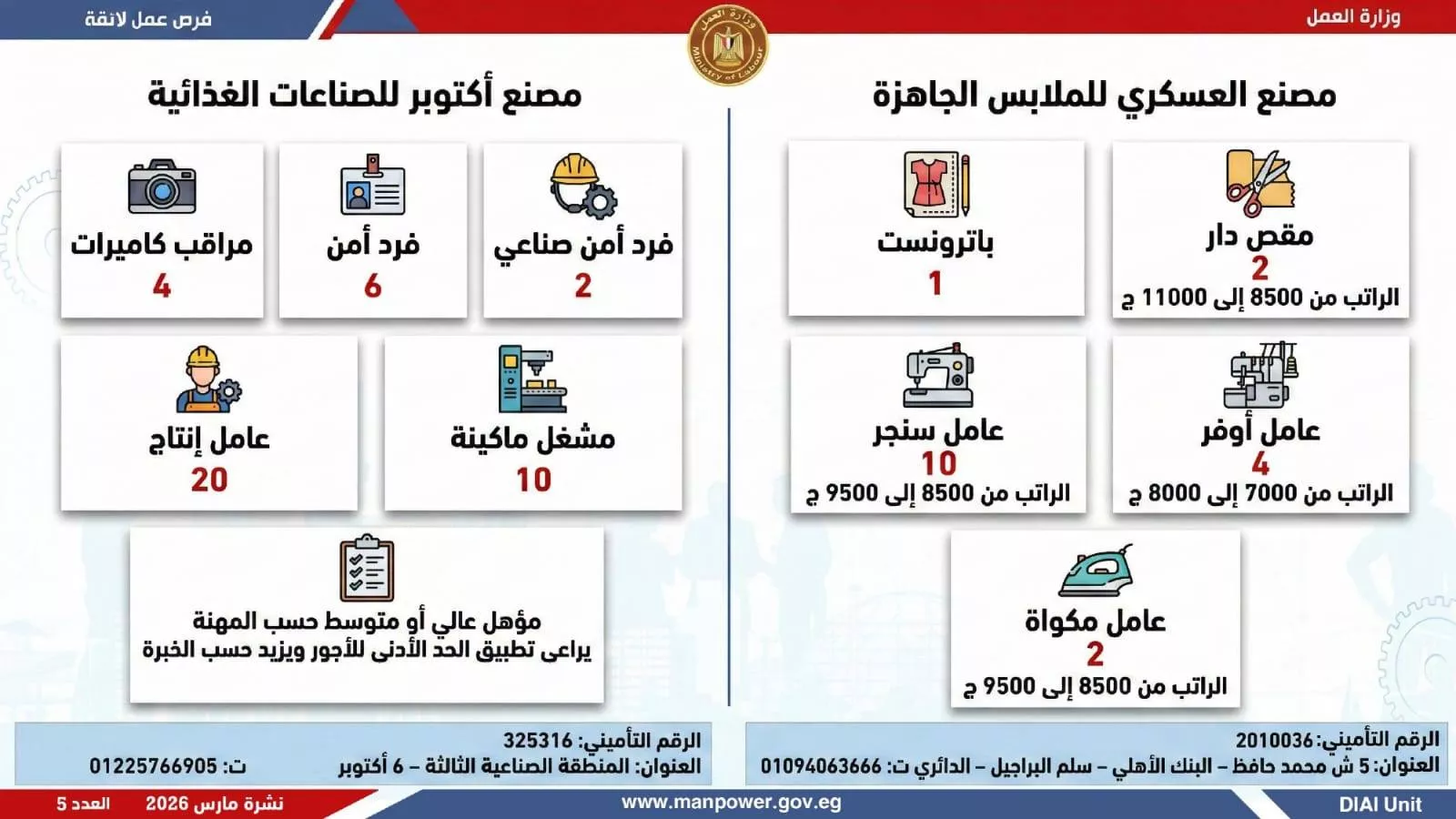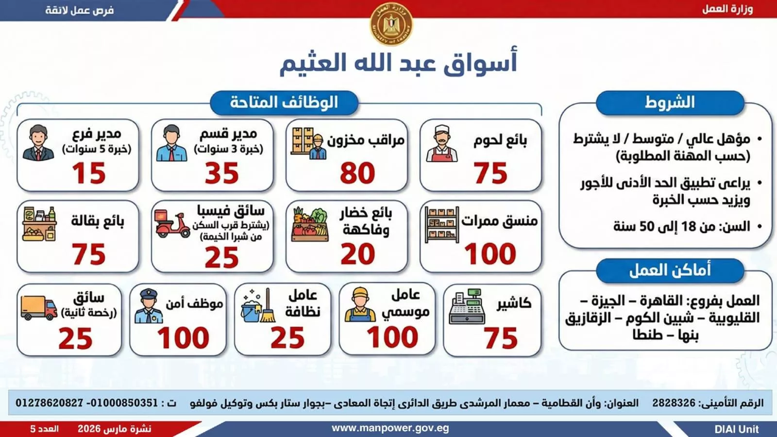 ونوهت الوزارة، إلى أن النشرة تضم فرصًا متنوعة في عشرات التخصصات والمهن، برواتب مجزية تُحدد وفق طبيعة الوظيفة والمقابلة الشخصية، مع التزام كامل بتطبيق الحد الأدنى للأجور، والاستفادة من مظلة التأمينات الاجتماعية والصحية، بما يضمن بيئة عمل آمنة ومستقرة تحفظ كرامة العامل وتصون حقوقه، كما تشمل النشرة فرصًا مخصصة لذوي الهمم في إطار سياسة الدمج المجتمعي والتمكين الاقتصادي الحقيقي.