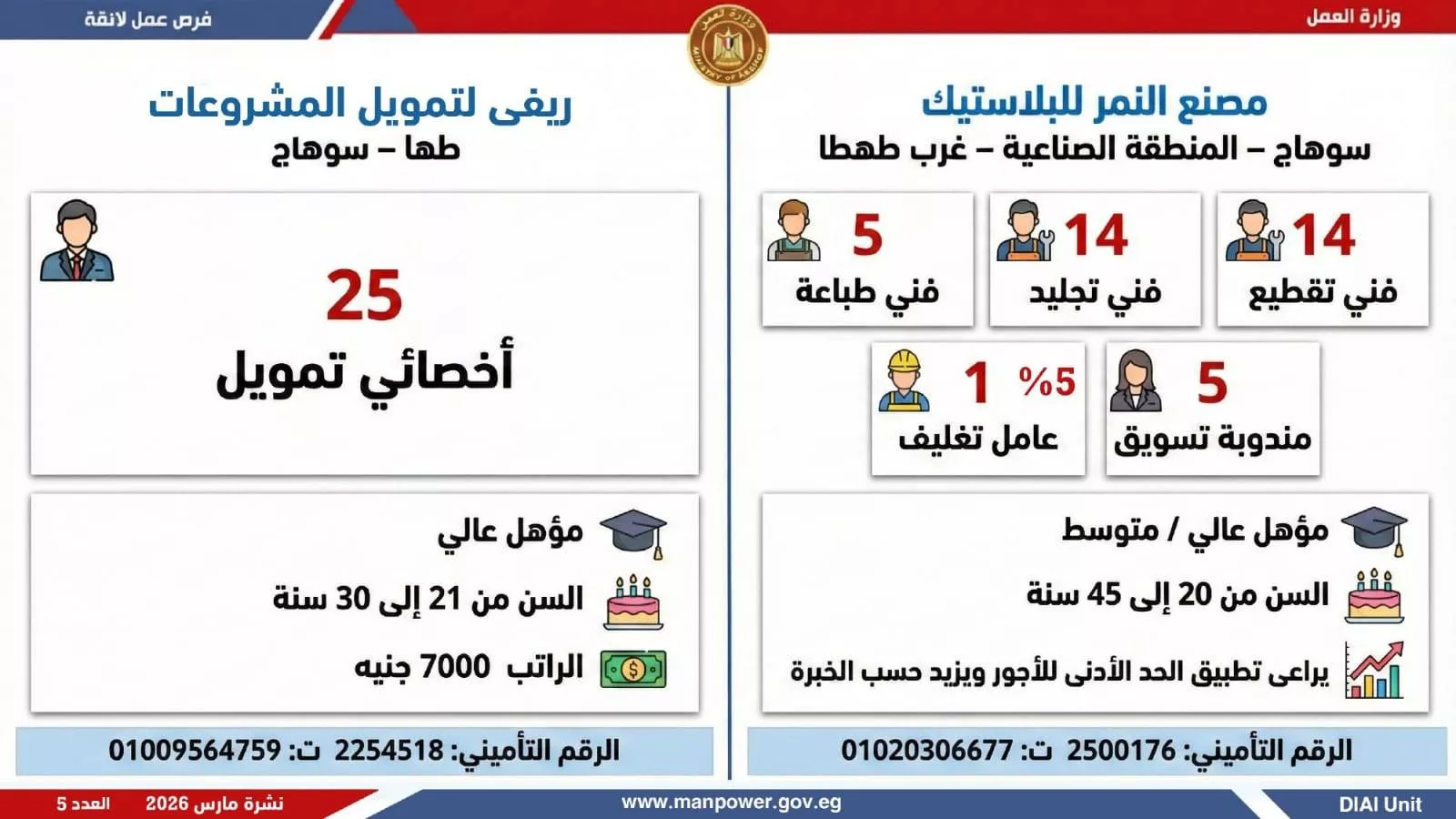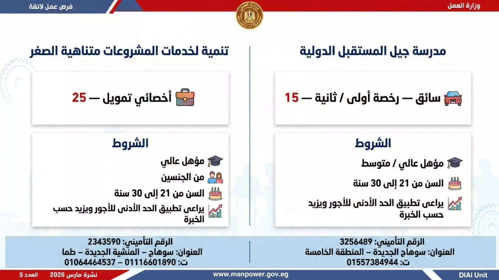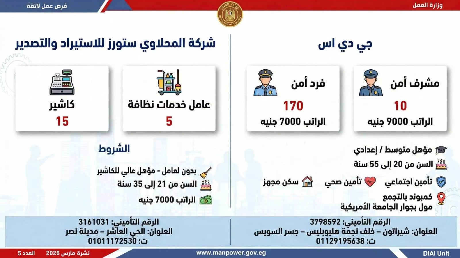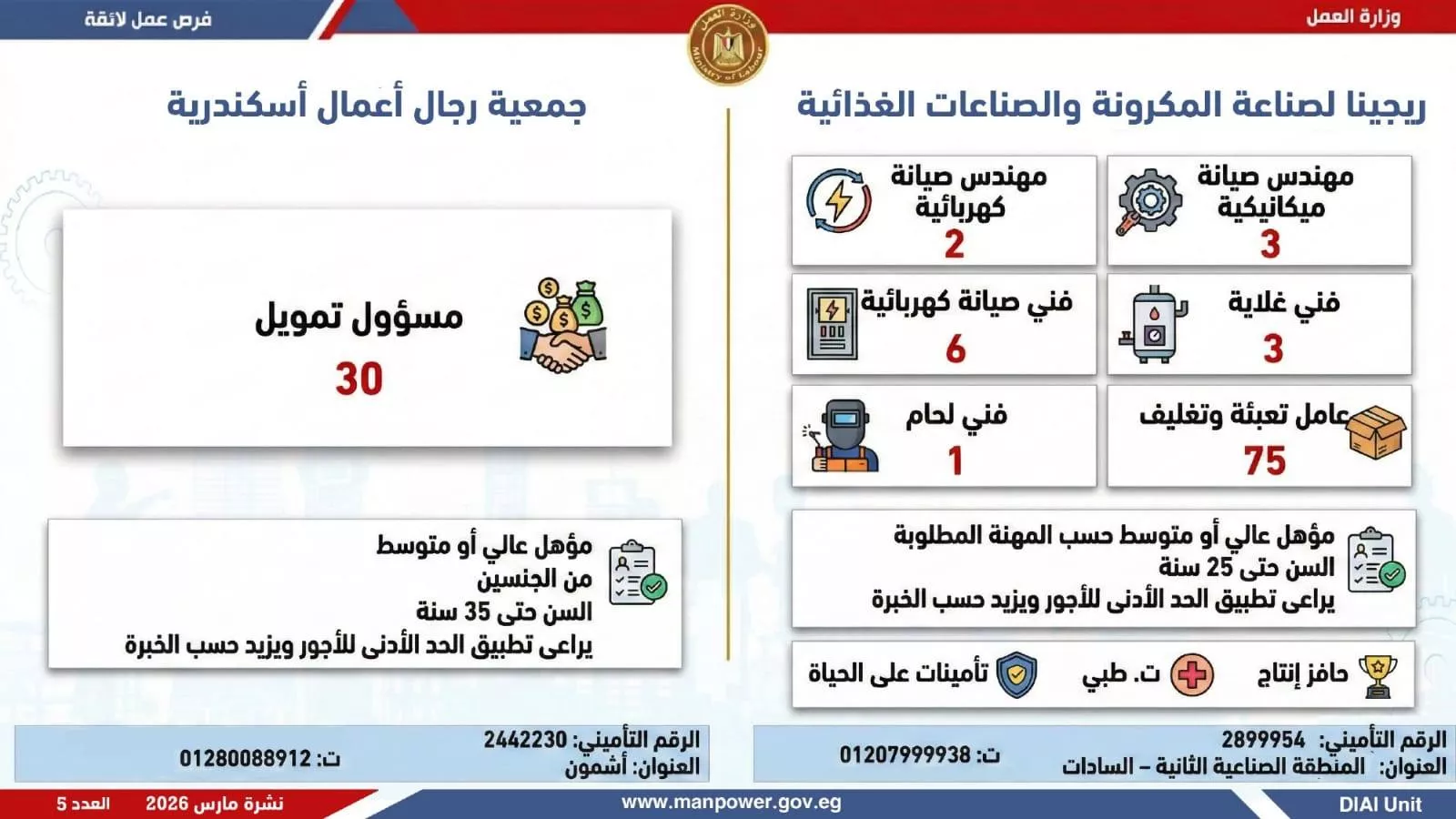 ونوهت الوزارة، إلى أن النشرة تضم فرصًا متنوعة في عشرات التخصصات والمهن، برواتب مجزية تُحدد وفق طبيعة الوظيفة والمقابلة الشخصية، مع التزام كامل بتطبيق الحد الأدنى للأجور، والاستفادة من مظلة التأمينات الاجتماعية والصحية، بما يضمن بيئة عمل آمنة ومستقرة تحفظ كرامة العامل وتصون حقوقه، كما تشمل النشرة فرصًا مخصصة لذوي الهمم في إطار سياسة الدمج المجتمعي والتمكين الاقتصادي الحقيقي.