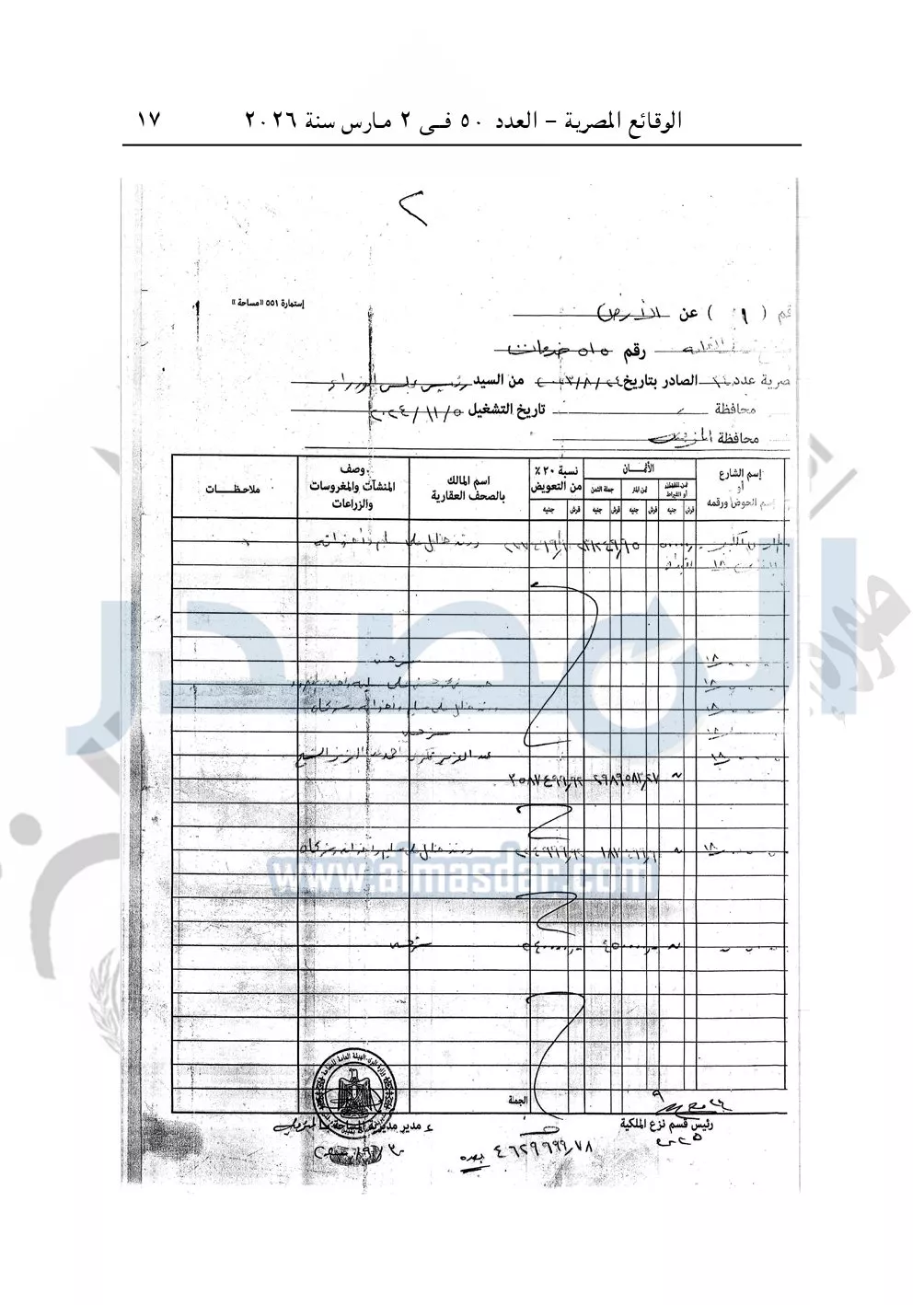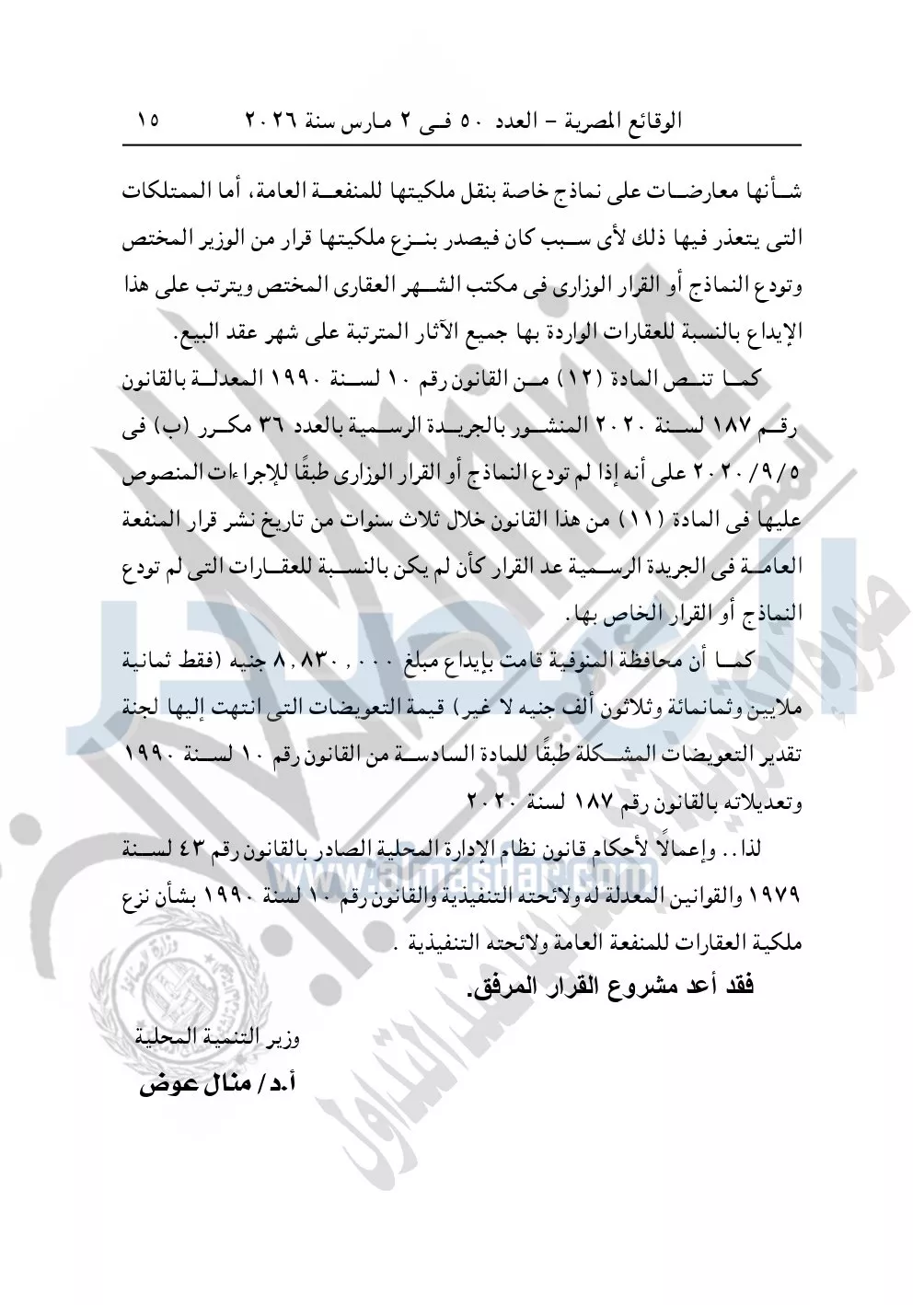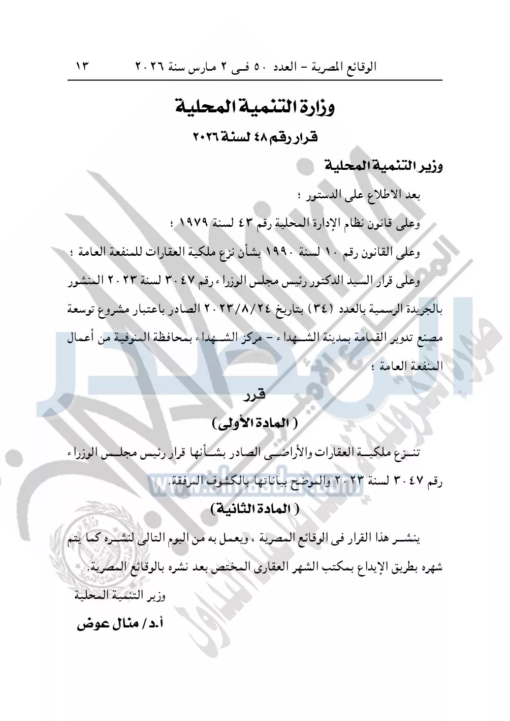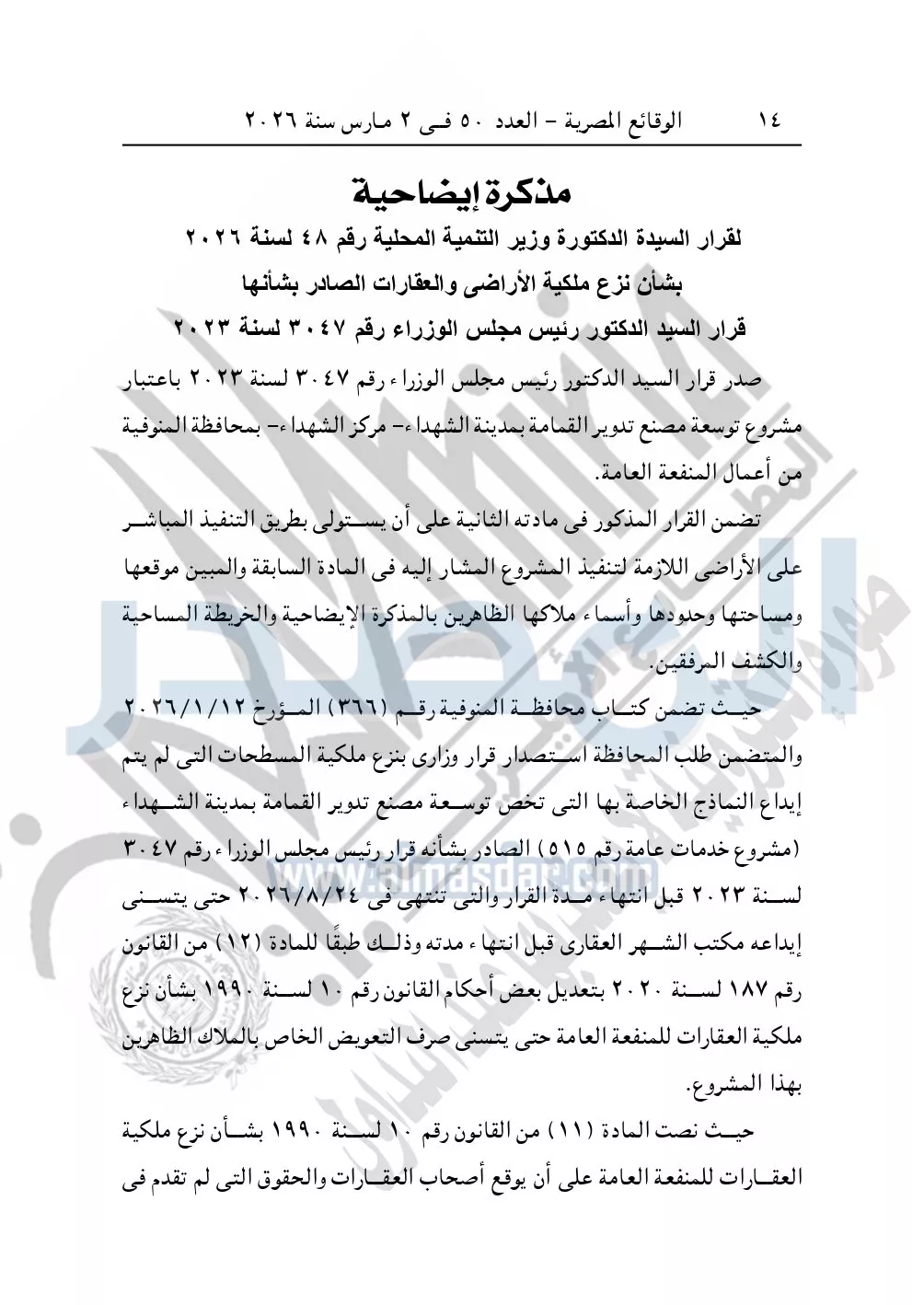 نشرت الوقائع المصرية في العدد 50، الصادر في 2 مارس سنة 2026، قرار وزارة التنمية المحلية، رقم 48 لسنة 2026، بشأن نزع ملكية أراضي وعقارات لتوسعة مشروع مصنع تدوير القمامة بمدينة الشهداء بمحافظة المنوفية.