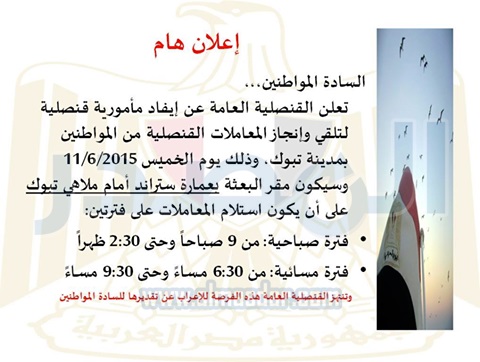 أخبار مصر "الخارجية": إيفاد مأمورية لإنجازالمعاملات القنصلية للمواطنين فى جدة الإثنين 08 يونيو 2015 - 03:21 م 6/8/2015 3:21:16 PM وزارة الخارجية المصدر -خاص طباعة شارك تعلن القنصلية المصرية العامة فى جدة عن إيفاد مأمورية لتلقي وإنجاز المعاملات القنصلية للمواطنين فى مدينة تبوك بالمملكة العربية السعودية ,وذلك يوم الخميس 11 يونيو 2015 طباعة شارك مصر المصريه السعودية 2015 تابع المصدر علي جوجل نيوز تطبيق نبض