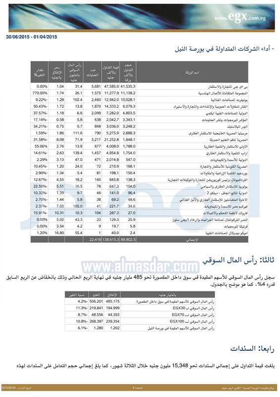 أظهر التقرير الربع سنوي للبورصة المصرية تراجع أداء مؤشرات السوق الرئيسية والثانوية فى الفترة من 1 ابريل الى 30 يونيو2015 ، حيث تراجع المؤشر الرئيسي للبورصة المصرية " إيجي اكس 30" بنسبة 8,36 % ليصل إلى مستوى 8372 نقطة.