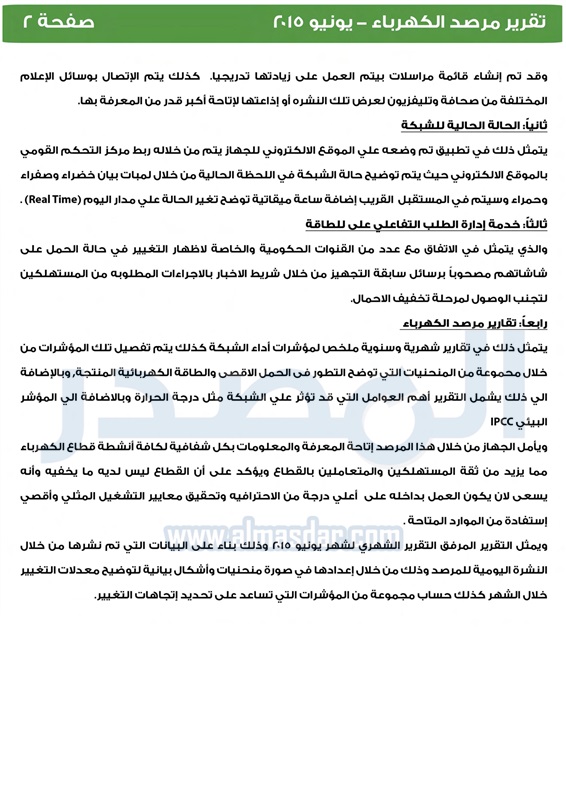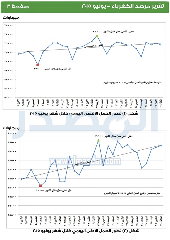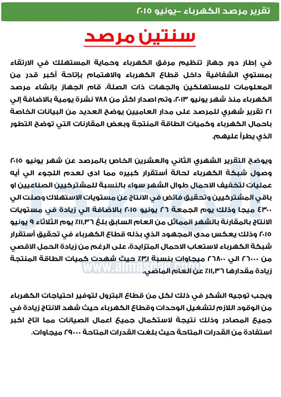كشف التقرير الشهري الثاني والعشرين الخاص بمرصد الكهرباء عن شهر يونيو 2015 عن وصول شبكة الكهرباء لحالة أستقرار كبيره مما ادى لعدم اللجوء الي أيه عمليات لتخفيف الاحمال طوال الشهر سواء بالنسبة للمشتركيين الصناعيين او باقي المشتركيين وتحقيق فائض في الانتاج عن مستويات الاستهلاك وصلت الي 4300 ميجا وذلك يوم الجمعة 26 يونيو 2015 بالاضافة الي زيادة في مستويات الانتاج بالمقارنة بالشهر المماثل من العام السابق بلغ 11.36% يوم الثلاثاء 9 يونيو 2015 وذلك يعكس مدى المجهود الذي بذله قطاع الكهرباء في تحقيق أستقرار شبكة الكهرباء لاستعاب الاحمال المتزايدة، على الرغم من زيادة الحمل الاقصي من 26000 الي 26800 ميجاوات بنسبة 3.1% حيث شهدت كميات الطاقة المنتجة زيادة مقدارها 11,36% عن العام الماضي.