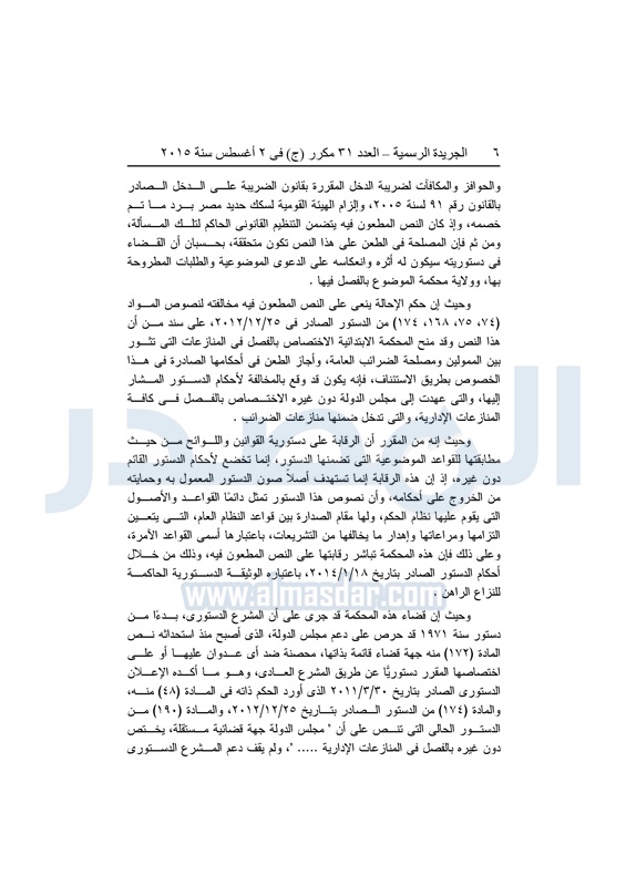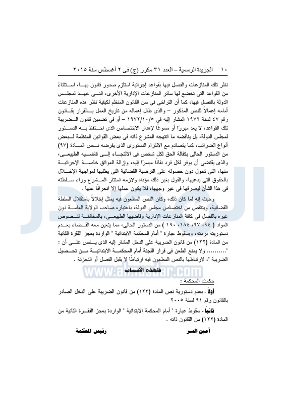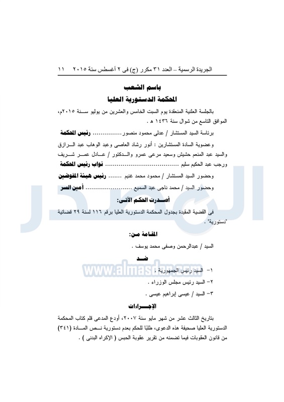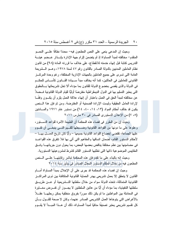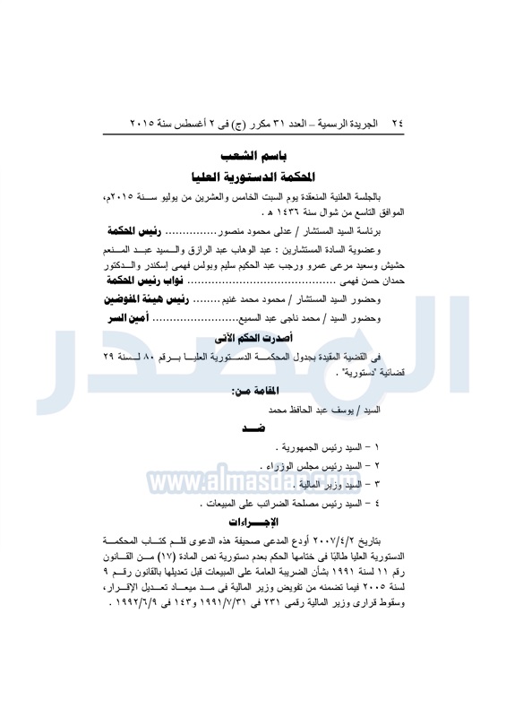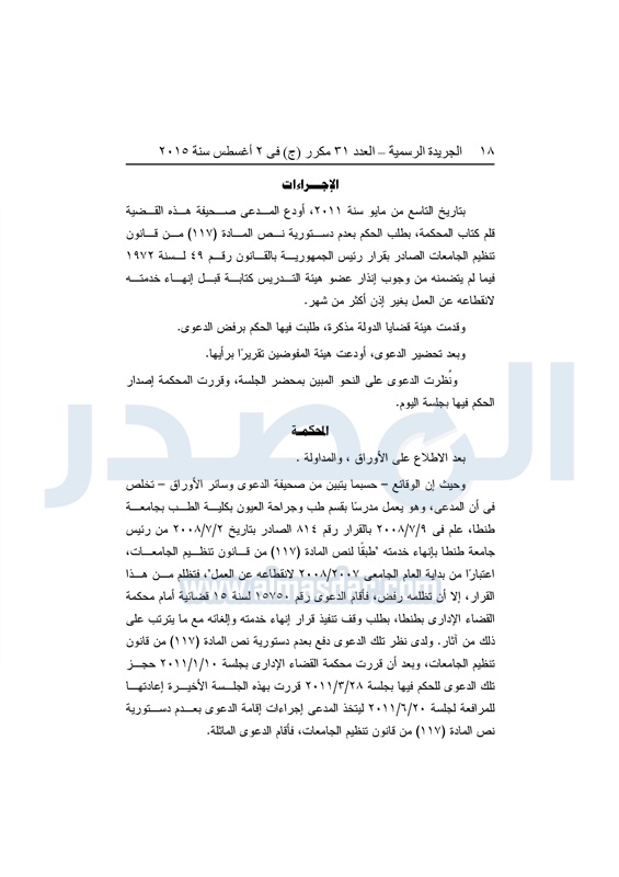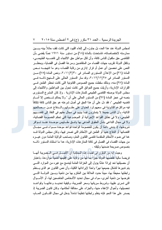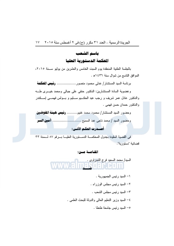 أخبار مصر "المصدر" تنشر أحكام المحكمة الدستورية العليا فى 4 دعاوى قضائية الثلاثاء 04 أغسطس 2015 - 05:32 م 8/4/2015 5:32:00 PM المستشار عدلى منصور المصدر - خاص طباعة شارك نشرت الجريدة الرسمية في العدد "31" مكرر"ج" الصادر بتاريخ 2 - 8 - 2015 أحكام المحكمة الدستورية العليا برئاسة المستشار عدلى منصور فى 4 قضايا مختلفة.وجاء نص الأحكام كالتالى: طباعة شارك تابع المصدر علي جوجل نيوز تطبيق نبض
