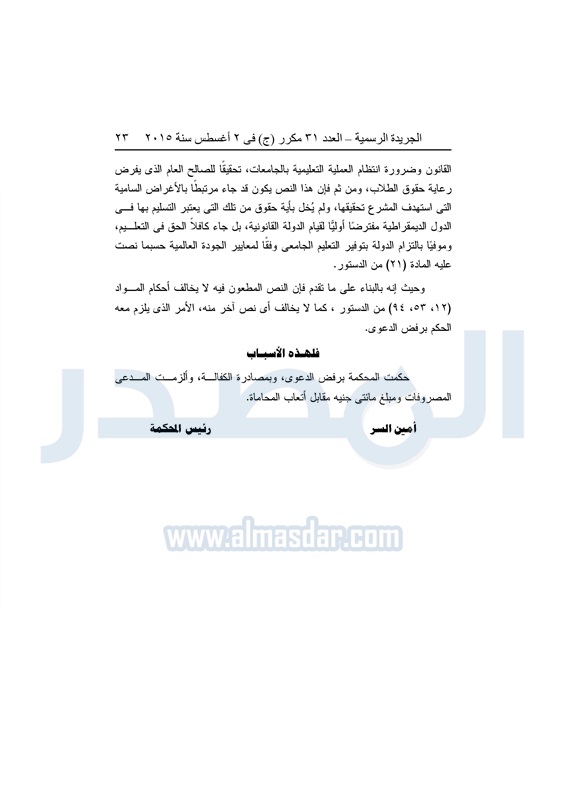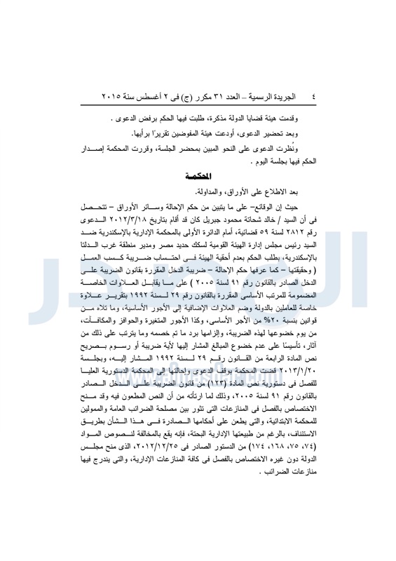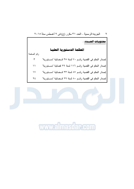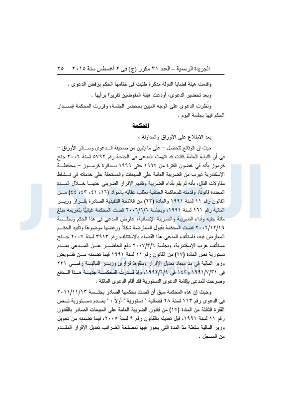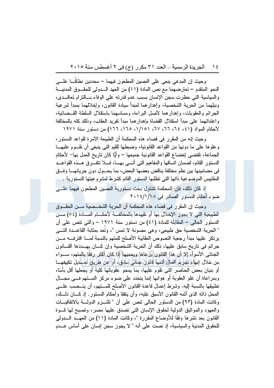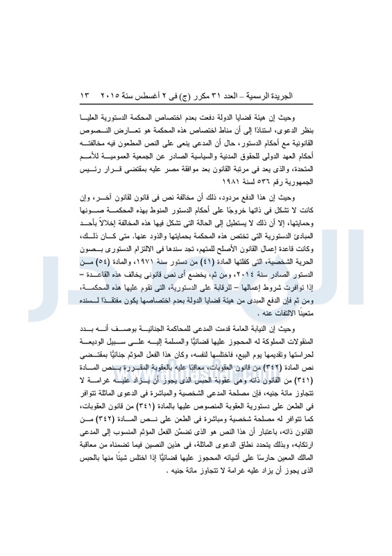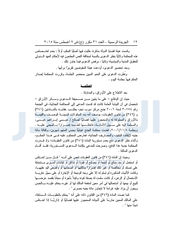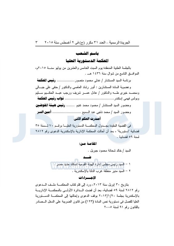 أخبار مصر "المصدر" تنشر أحكام المحكمة الدستورية العليا فى 4 دعاوى قضائية الثلاثاء 04 أغسطس 2015 - 05:32 م 8/4/2015 5:32:00 PM المستشار عدلى منصور المصدر - خاص طباعة شارك نشرت الجريدة الرسمية في العدد "31" مكرر"ج" الصادر بتاريخ 2 - 8 - 2015 أحكام المحكمة الدستورية العليا برئاسة المستشار عدلى منصور فى 4 قضايا مختلفة.وجاء نص الأحكام كالتالى: طباعة شارك تابع المصدر علي جوجل نيوز تطبيق نبض