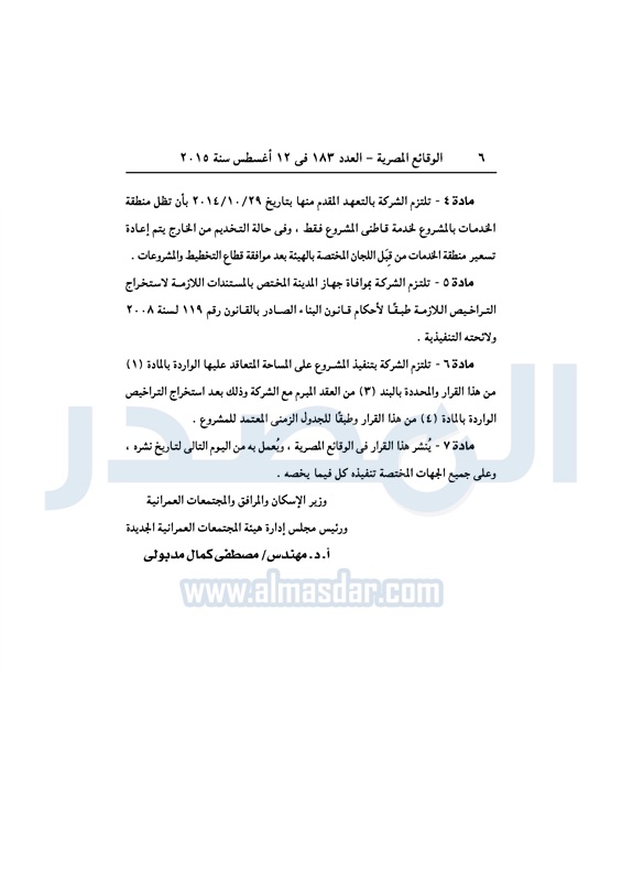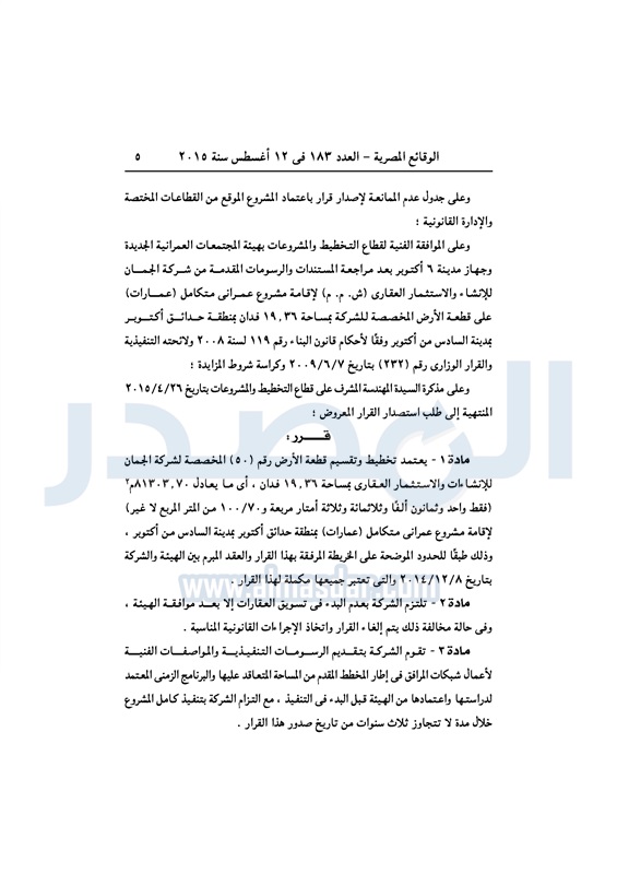 نشرت الجريدة الرسمية في العدد "183" الصادر بتاريخ الثانى عشر من أغسطس 2015 قراراً لوزارة الإسكان والمرافق والمجتمعات العمرانية باعتماد تخطيط وتقسيم قطعة أرض بمنطقة حدائق أكتوبر بمدينة 6 أكتوبر والمخصصة لشركة الجمان للإنشاءات والاستثمار العقارى لإقامة مشروع عمرانى متكامل "عمارات".