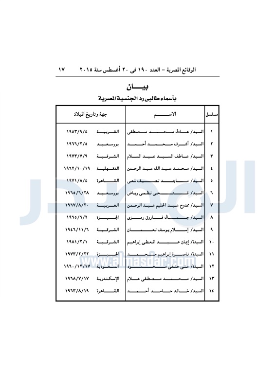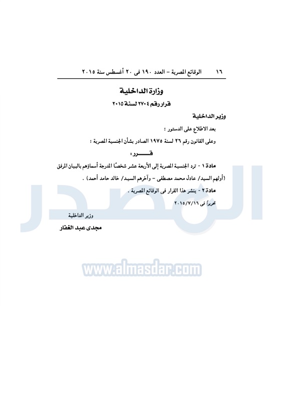 أخبار مصر وزير "الداخلية" يقرر رد الجنسية المصرية لـ "14" شخصاً الخميس 20 أغسطس 2015 - 03:55 م 8/20/2015 3:55:40 PM مجدى عبد الغفار وزير الداخلية المصدر - خاص طباعة شارك نشرت الجريدة الرسمية في العدد "190" الصادر فى 20 أغسطس 2015 قراراً لوزير الداخلية اللواء مجدى عبد الغفار برد الجنسية المصرية لـ "14" شخصاً.وجاء نص القرار كالتالى: طباعة شارك وزير الداخلية اللواء مجدى عبد الغفار الجريدة الرسمية تابع المصدر علي جوجل نيوز تطبيق نبض