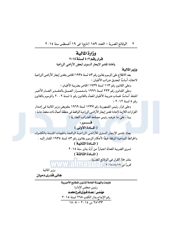 نشرت الجريدة الرسمية في العدد "189" الصادر فى 19 أغسطس 2015 قراراً لوزير المالية هاني قدري دميان بإعادة تقدير الإيجار السنوي للأراضي الزراعية الواقعة بالجهات المثبتة بالكشوف والخرائط المساحية المرفقة طبقاً لأحكام المرسوم بقانون رقم 53 لسنة 1935 المشار إليه.