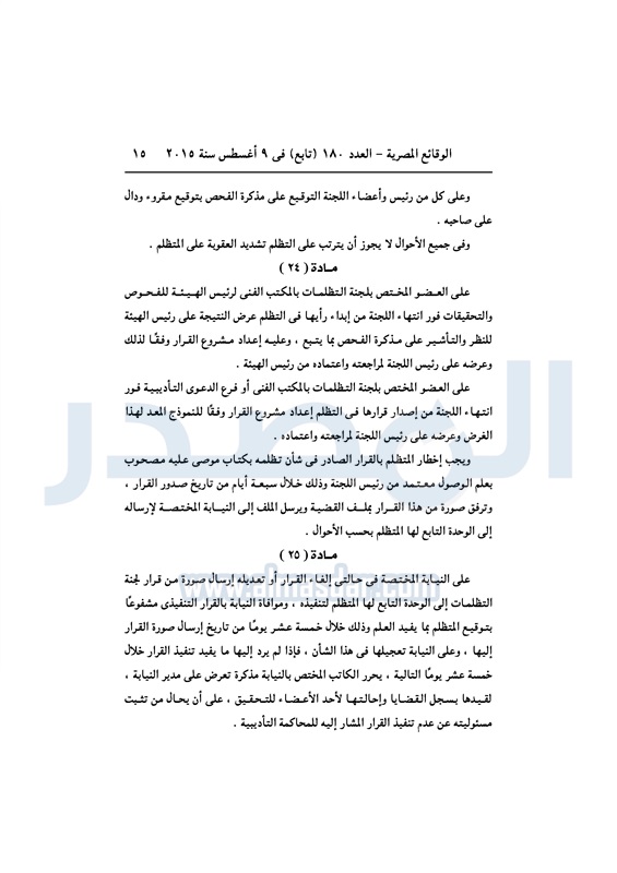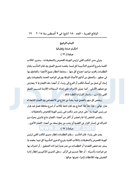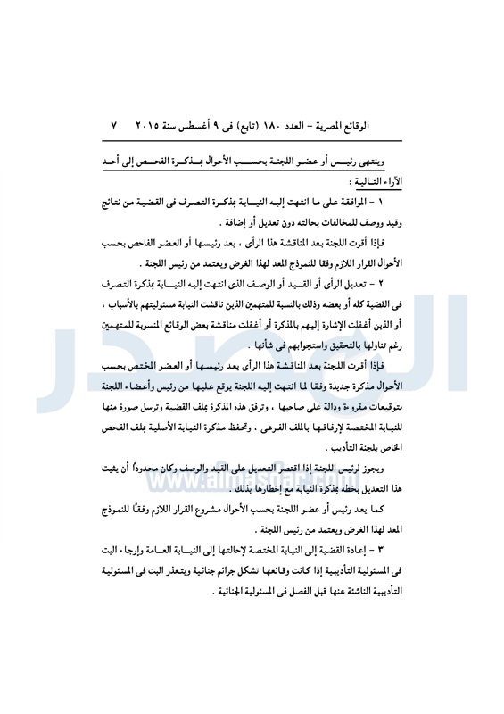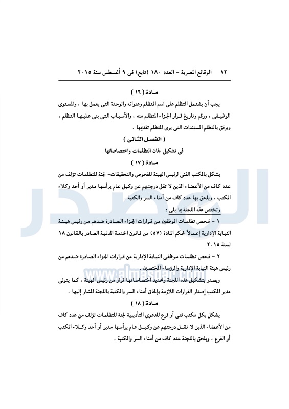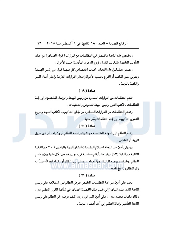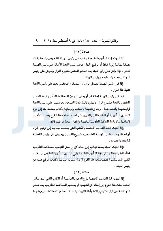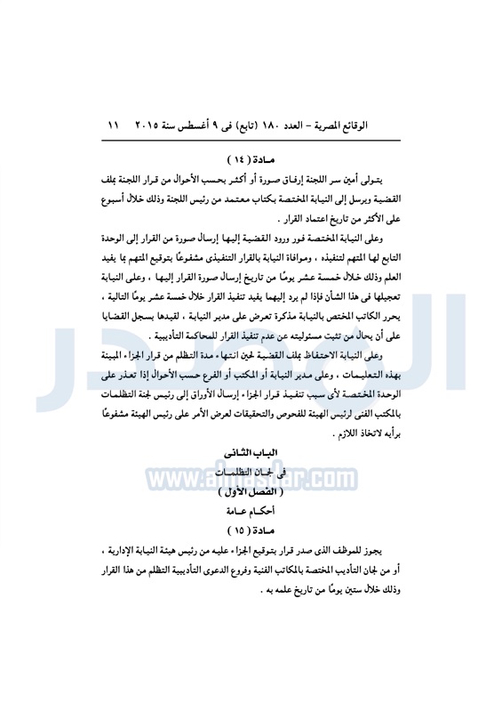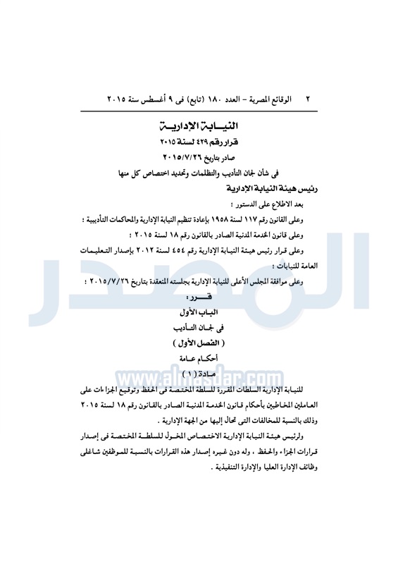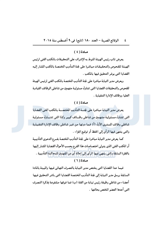 نشرت الجريدة الرسمية في العدد "180" تابع الصادر فى 9 أغسطس 2015 قراراً لرئيس هيئة النيابة الإدارية بشأن لجان التأديب والتظلمات وتحديد إختصاص كلاً منها.