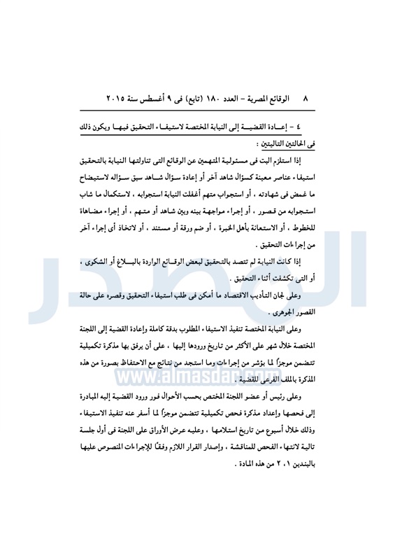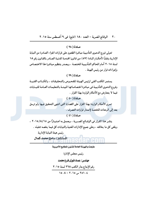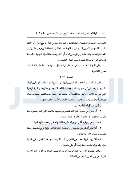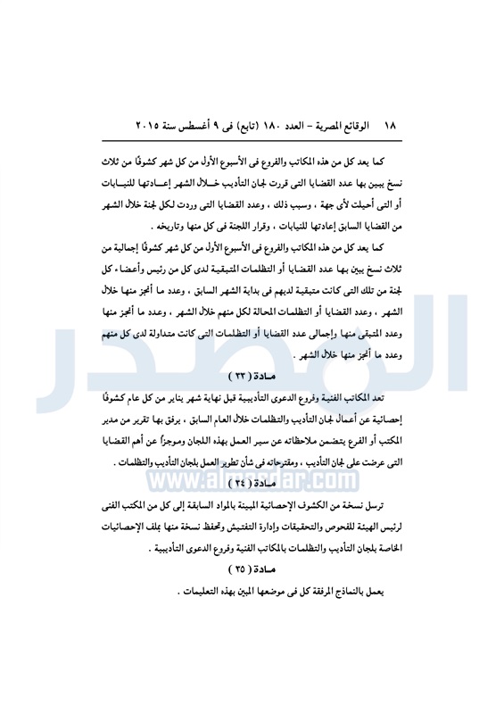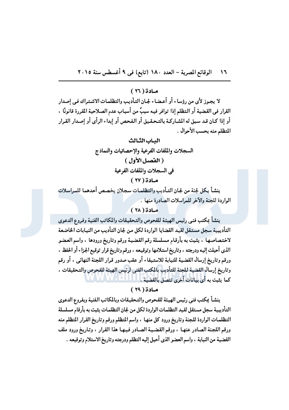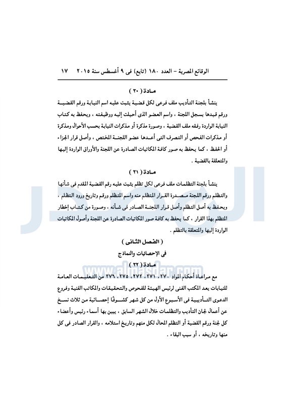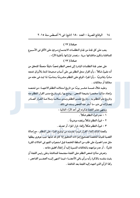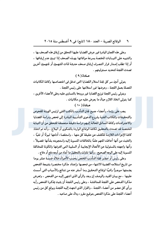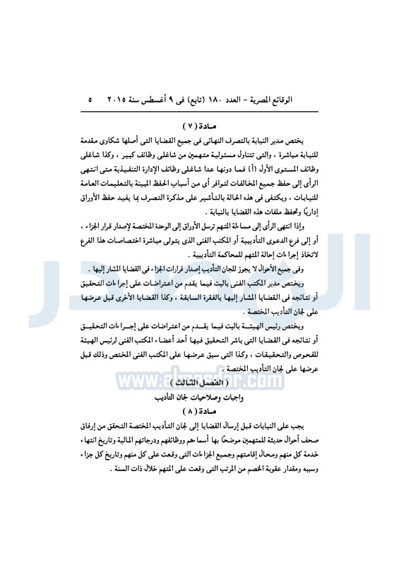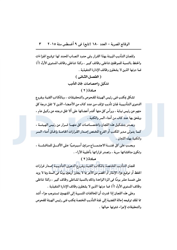 نشرت الجريدة الرسمية في العدد "180" تابع الصادر فى 9 أغسطس 2015 قراراً لرئيس هيئة النيابة الإدارية بشأن لجان التأديب والتظلمات وتحديد إختصاص كلاً منها.