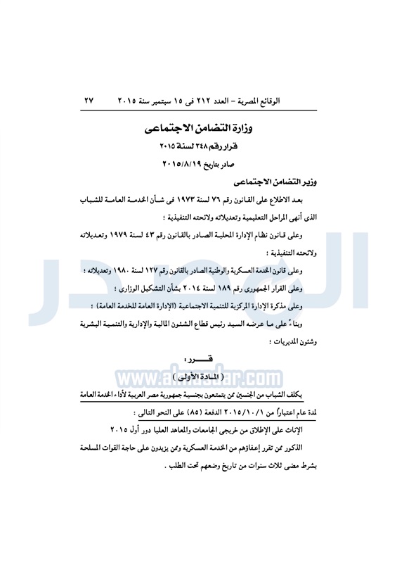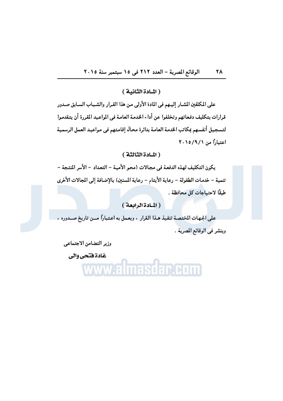 أخبار مصر وزيرة"التضامن" تصدر قراراً بشأن أداء الخدمة العامة لمدة عام الثلاثاء 15 سبتمبر 2015 - 04:10 م 9/15/2015 4:10:00 PM غادة والي وزيرة التضامن الاجتماعي المصدر - خاص طباعة شارك نشرت الجريدة الرسمية في العدد "212" تابع الصادر فى 15 سبتمبر 2015 قراراً لوزيرة التضامن الإجتماعى بشأن أداء الخدمة العامة.وجاء نص القرار كالتالى: طباعة شارك الجريدة الرسمية 2015 تابع المصدر علي جوجل نيوز تطبيق نبض