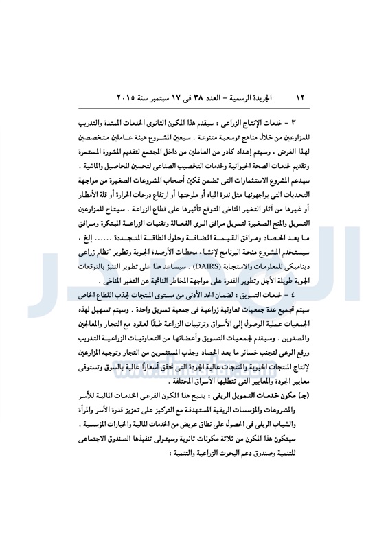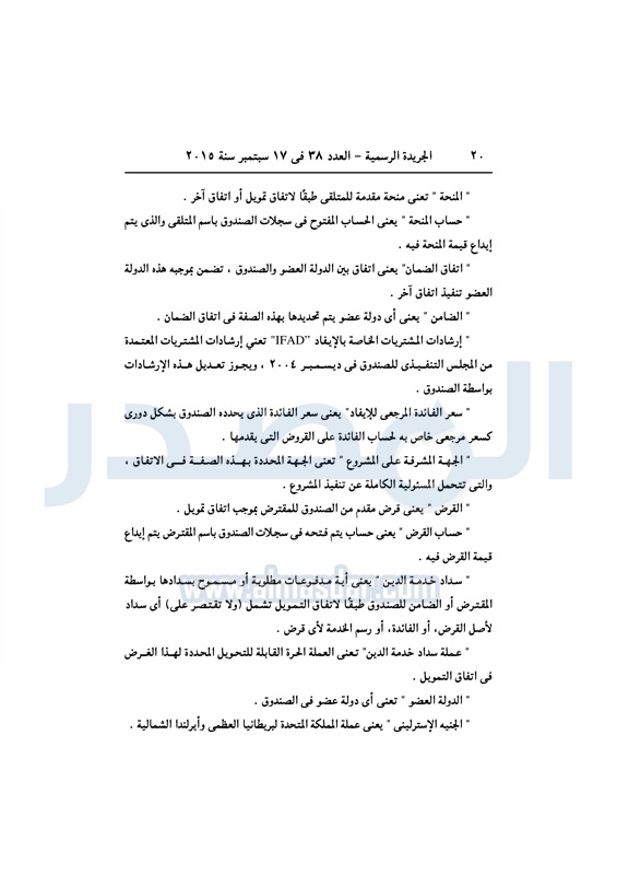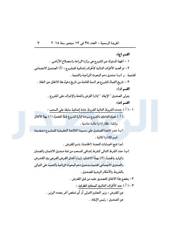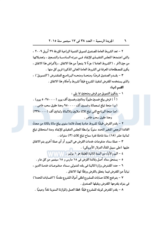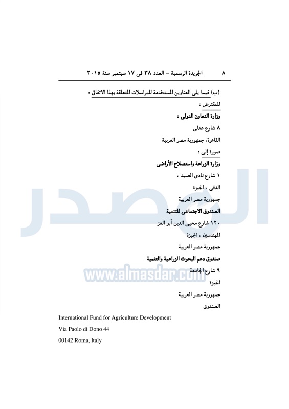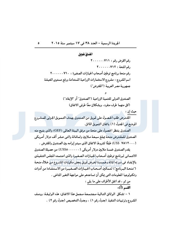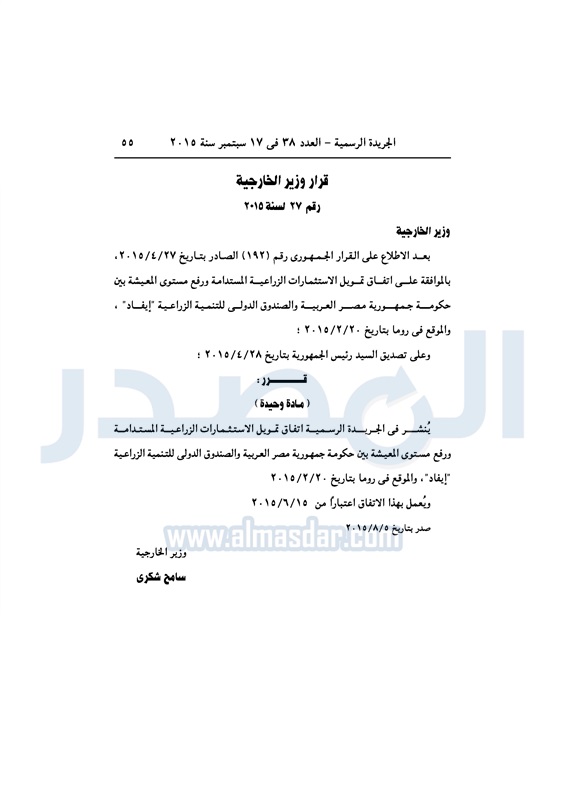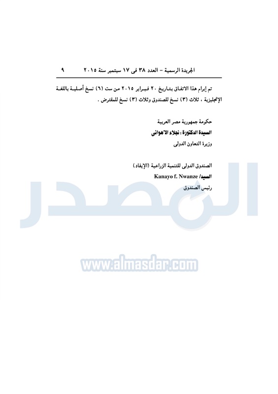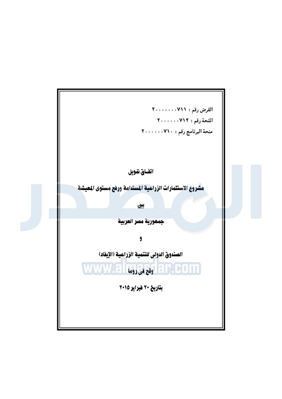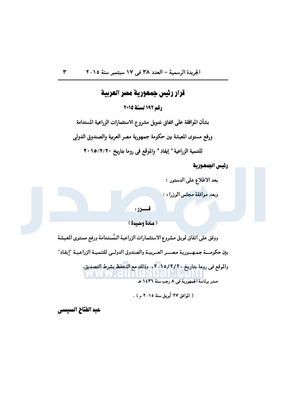 نشرت الجريدة الرسمية في العدد "38" الصادر فى 17 سبتمبر 2015 قراراً لرئيس الجمهورية عبد الفتاح السيسى بشأن الموافقة على إتفاق تمويل مشروع الإستثمارات الزراعية المستدامة ورفع مستوى المعيشة بين مصر والصندوق الدولى للتنمية الزراعية "إيفاد".