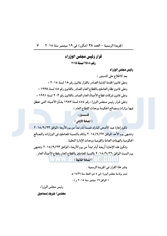 أخبار مصر "المصدر" تنشر نص قرار رئيس "الوزراء" بشأن إجازة عيد الأضحى الأحد 20 سبتمبر 2015 - 04:16 م 9/20/2015 4:16:00 PM شريف إسماعيل رئيس مجلس الوزراء المصدر - خاص طباعة شارك نشرت الجريدة الرسمية في العدد "38" مكرر الصادر فى 19 سبتمبر 2015 قراراً لرئيس مجلس الوزراء المهندس شريف إسماعيل بشأن إجازة عيد الأضحى.وجاء نص القرار كالتالى: طباعة شارك مجلس الوزراء شريف اسماعيل رئيس الوزراء المصدر الجريدة الرسمية 2015 تابع المصدر علي جوجل نيوز تطبيق نبض