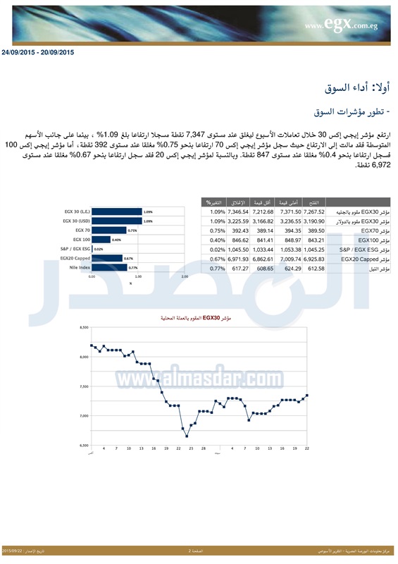 أظهر التقرير الأسبوعي للبورصة المصرية إرتفاع أداء مؤشرات السوق الرئيسية والثانوية ، حيث إرتفع المؤشر الرئيسي للبورصة المصرية "إيجي اكس 30" بنسبة 1,09 % ليصل إلى مستوى 7347 نقطة.