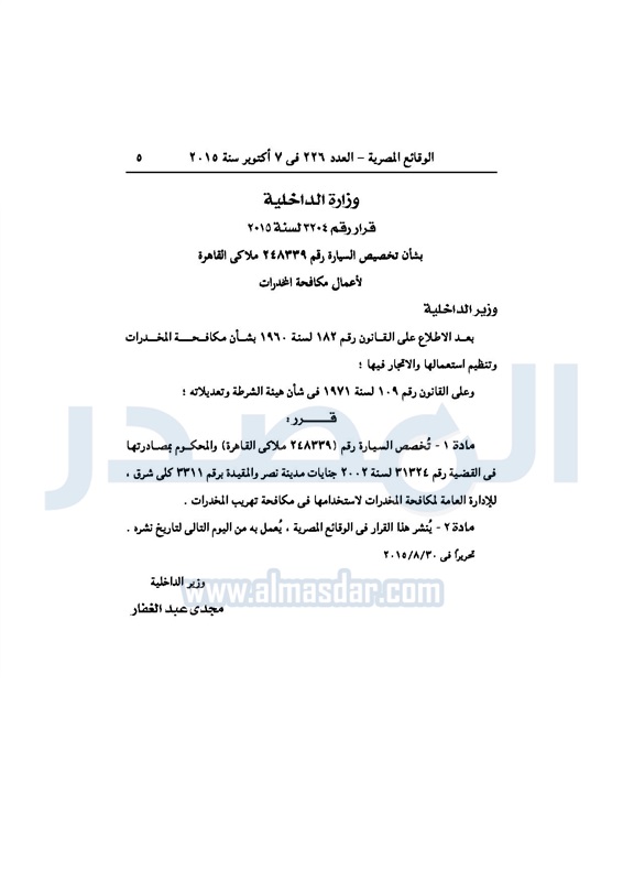 نشرت الوقائع المصرية في العدد "226" الصادر فى 7 أكتوبر 2015 قراراً لوزير الداخلية بشأن تخصيص السيارة رقم 31324 ملاكي القاهرة والمقيدة برقم 3311 كلي شرق، للإدارة العامة لمكافحة المخدرات لاستخدامها في مكافحة تهريب المخدرات، وجاء نص القرار كالتالى: