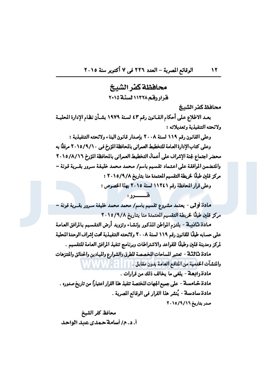 نشرت الوقائع المصرية في العدد "226" الصادر فى 7 أكتوبر 2015 قراراً لمحافظ كفر الشيخ بشأن اعتماد مشروع تقسيم باسم، محمد محمد خليفة سرور بقرية قونة مركز قلين، وإلزامه بتزويد أرض التقسيم بالمرافق العامة، وجاء نص القرار كالتالى: