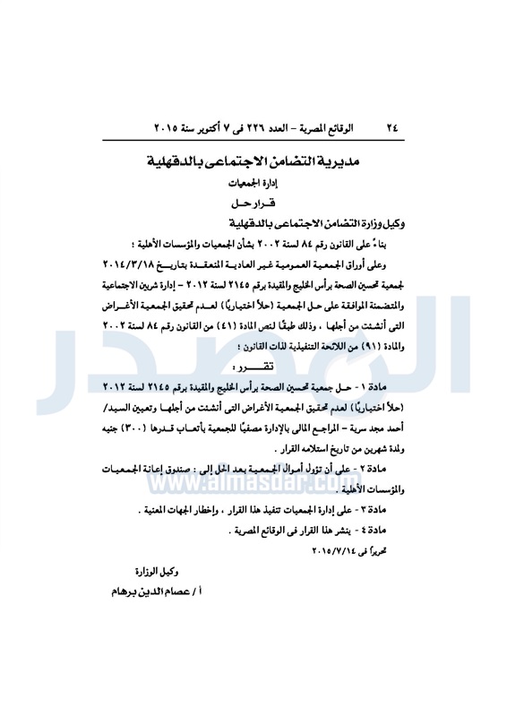 أخبار مصر "التضامن الاجتماعي" بالدقهلية تقرر حل جمعية "تحسين الصحة" الأربعاء 07 أكتوبر 2015 - 11:35 ص 10/7/2015 11:35:01 AM صورة ارشيفية المصدر - خاص طباعة شارك نشرت الوقائع المصرية في العدد "226" الصادر فى 7 أكتوبر 2015 قراراً لمدير مديرية التضامن الاجتماعي بالدقهلية، بشأن حل جمعية "تحسين الصحة" برأس الخليج، وجاء نص القرار كالتالى: طباعة شارك مصر خليج الين المصريه 2015 تابع المصدر علي جوجل نيوز تطبيق نبض