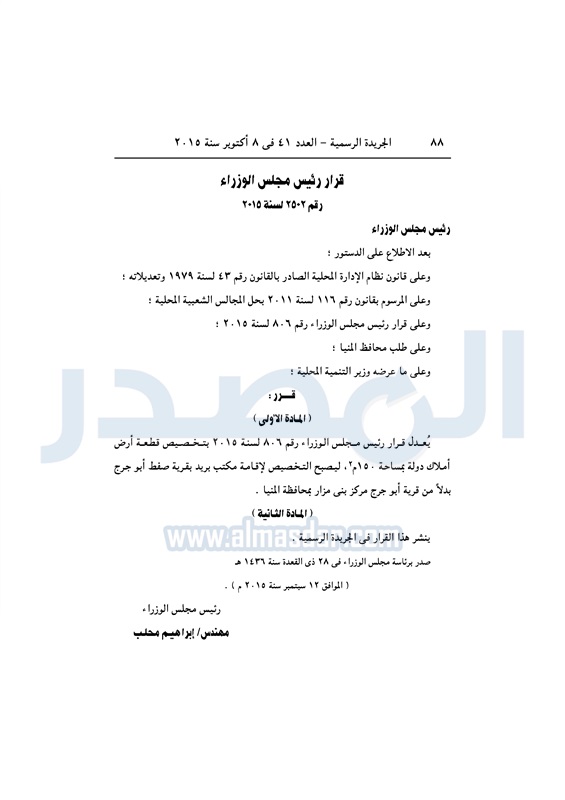 نشرت الجريدة الرسمية في العدد "41" الصادر فى 8 أكتوبر 2015، قراراً للمهندس إبراهيم محلب رئيس مجلس الوزراء السابق، بشأن إعادة تخصيص قطعة أرض ملك الدولة بمساحة 150 متر مربع، لإقامة مكتب بريد بقرية صفط أبو جرج بدلا من قرية أبو جرج مركز بني مزار بمحافظة المنيا، وجاء نص القرار كالأتي:
