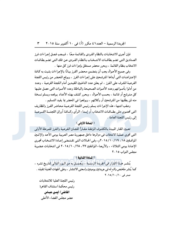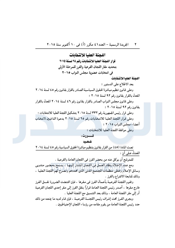 نشرت الجريدة الرسمية فى العدد 41 مكرر الصادر فى 10 أكتوبر 2015 قرار اللجنة العليا للإنتخابات رقم 92 لعام 2015 بتحديد مقار اللجان الفرعية والفرز للمرحلة الأولى فى إنتخابات عضوية مجلس النواب المقبل