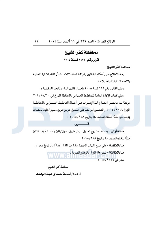 محافظات محافظ كفر الشيخ يعتمد مشروع تعديل طريق "دسوق - قلين" الأحد 11 أكتوبر 2015 - 02:23 م 10/11/2015 2:23:31 PM صورة ارشيفية المصدر - خاص طباعة شارك نشرت الوقائع المصرية في العدد "228" الصادر فى 10 أكتوبر2015 قراراً لمحافظ كفر الشيخ، بشأن اعتماد مشروع تعديل عرض طريق "دسوق - قلين"، وجاء نص القرار كالتالى: طباعة شارك تابع المصدر علي جوجل نيوز تطبيق نبض