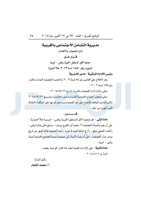 أخبار مصر "التضامن الاجتماعي" بالغربية تقرر حل جمعية "آفاق المستقبل" الإثنين 12 أكتوبر 2015 - 01:00 م 10/12/2015 1:00:26 PM صورة ارشيفية المصدر - خاص طباعة شارك نشرت الوقائع المصرية في العدد "230" الصادر فى 12 أكتوبر2015 قراراً لوكيل وزارة التضامن الاجتماعي بالغربية، بشأن حل جمعية "آفاق المستقبل" الخيرية بزفتى، وجاء نص القرار كالتالى: طباعة شارك مصر المصريه 2015 تابع المصدر علي جوجل نيوز تطبيق نبض