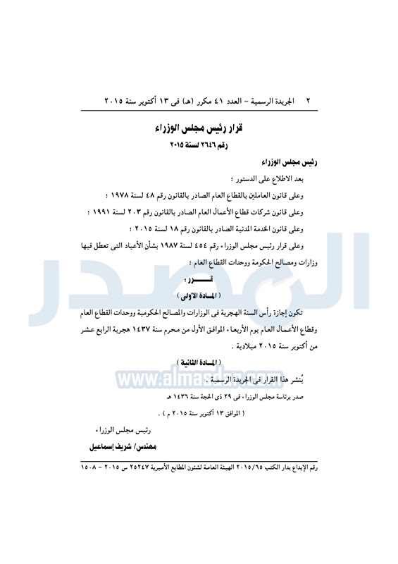 نشرت الجريدة الرسمية فى العدد 41 مكرر "ه" الصادر فى 13 أكتوبر 2015، قرار رئيس مجلس الوزراء أن تكون إجازة رأس السنة الهجرية في الوزارات والمصالح الحكومية ووحدات القطاع العام وقطاع الأعمال العام يوم الأربعاء الموافق الأول من محرم سنة 1437 هجريةالموافق 14 أكتوبر 2015، وجاء نص القرار كالتالي: