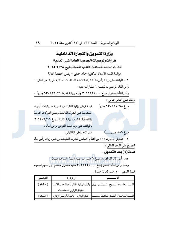 أسواق وزير "التموين" يقرر زيادة رأس مال الشركة القابضة للصناعات الغذائية الأحد 18 أكتوبر 2015 - 11:28 ص 10/18/2015 11:28:39 AM خالد حنفي المصدر - خاص طباعة شارك نشرت الوقائع المصرية في العدد "233" الصادر فى 17 أكتوبر 2015، قرار وزير التموين بشأن الموافقة على زيادة رأس مال الشركة القابضة للصناعات الغذائية، وجاء نصص القرارا كالتالى: طباعة شارك وزير التموين مصر شركة رأس المال الين المصريه 2015 تابع المصدر علي جوجل نيوز تطبيق نبض