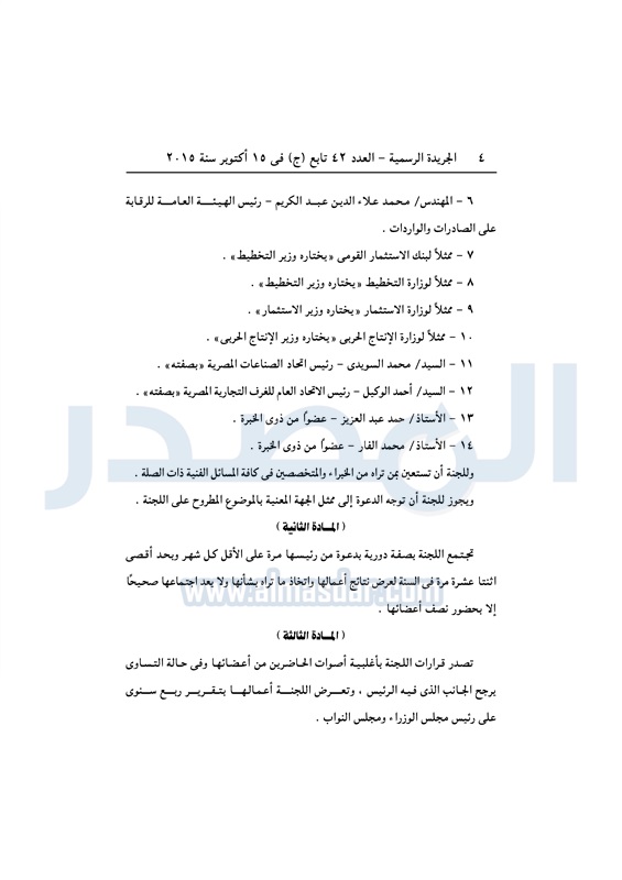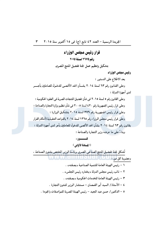 أخبار مصر رئيس الوزراء يقرر تشكيل لجنة "تفضيل المنتج المصري" الأحد 18 أكتوبر 2015 - 01:51 م 10/18/2015 1:51:40 PM صورة ارشيفية المصدر - خاص طباعة شارك نشرت الجريدة الرسمية في العدد "42" تابع "ج" الصادر فى 15 أكتوبر 2015، قرار رئيس مجلس الوزراء بتشكيل وتنظيم عمل لجنة تفضيل المنتج المصري برئاسة وزير الصناعة، وجاء نص القرار كالتالي: طباعة شارك مصر مجلس الوزراء رئيس الوزراء الجريدة الرسمية 2015 تابع المصدر علي جوجل نيوز تطبيق نبض