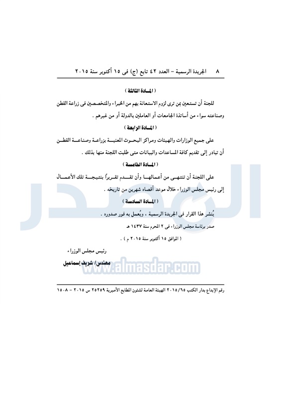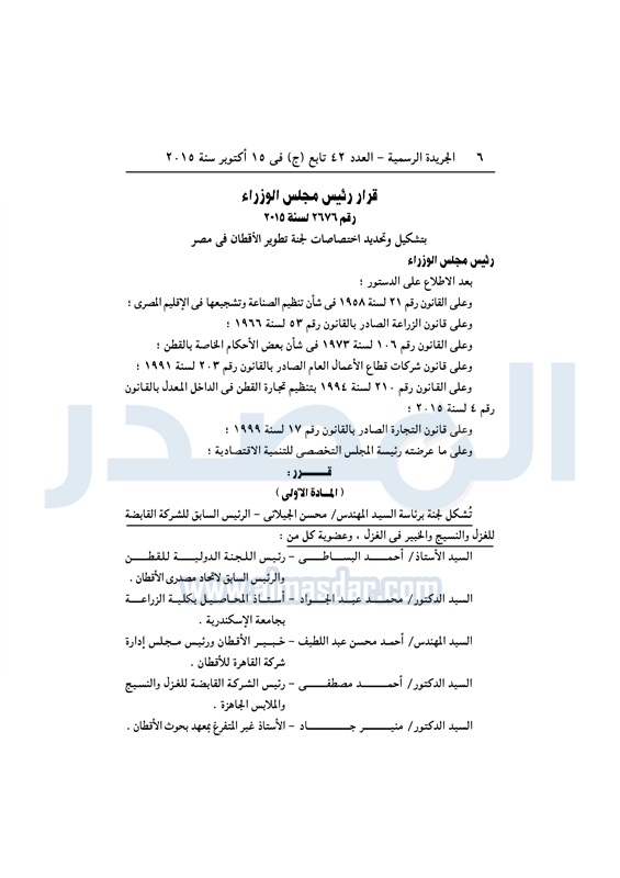 أسواق رئيس الوزراء يقرر تشكيل لجنة لتطوير الأقطان في مصر الأحد 18 أكتوبر 2015 - 01:56 م 10/18/2015 1:56:50 PM صورة ارشيفية المصدر - خاص طباعة شارك نشرت الجريدة الرسمية في العدد "42" تابع "ج" الصادر فى 15 أكتوبر 2015، قرار رئيس مجلس الوزراء بتشكيل وتحديد اختصاصات لجنة تطوير الأقطان في مصر، وجاء نص القرار كالتالي: طباعة شارك مصر مجلس الوزراء رئيس الوزراء الحديد الجريدة الرسمية 2015 تابع المصدر علي جوجل نيوز تطبيق نبض