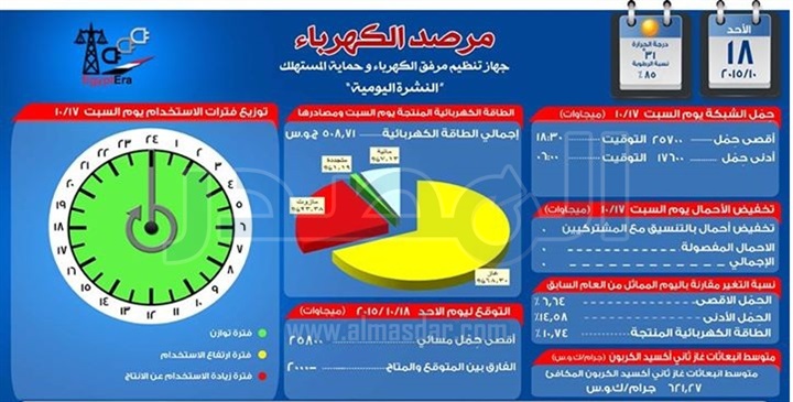 ونوه المركز القومي للتحكم في الطاقة بأن مؤشر حالة الحمل ظهر اليوم الأحد باللون الأخضر منذ منتصف الليل وبداية اليوم حتى العاشرة صباحاً.