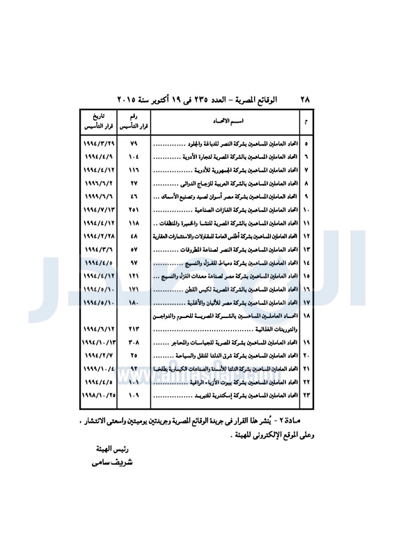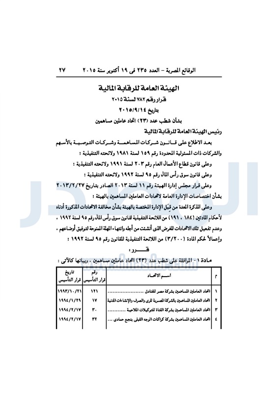 أسواق "الرقابة المالية" تقرر شطب 23 اتحادًا عاملًا الإثنين 19 أكتوبر 2015 - 01:25 م 10/19/2015 1:25:29 PM شريف سامي المصدر - خاص طباعة شارك نشرت الوقائع المصرية في العدد "235" الصادر فى 19 أكتوبر 2015، قرار رئيس مجلس إدارة الهيئة العامة للرقابة المالية، بشأن شطب 23 اتحاد عاملين مساهمين، وجاء القرار كالتالي: طباعة شارك تابع المصدر علي جوجل نيوز تطبيق نبض