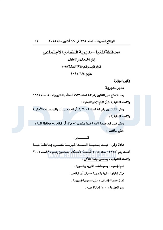 محافظات "التضامن الاجتماعي" بالمنيا تقرر قيد جمعية "الحمد الخيرية" الإثنين 19 أكتوبر 2015 - 01:42 م 10/19/2015 1:42:23 PM صورة ارشيفية المصدر - خاص طباعة شارك نشرت الوقائع المصرية في العدد "235" الصادر فى 19 أكتوبر 2015، قرار وكيل وزارة التضامن الاجتماعي بمحافظة المنيا، بشأن قيد جمعية "الحمد الخيرية"، وجاء نص القرار كالتالي: طباعة شارك تابع المصدر علي جوجل نيوز تطبيق نبض