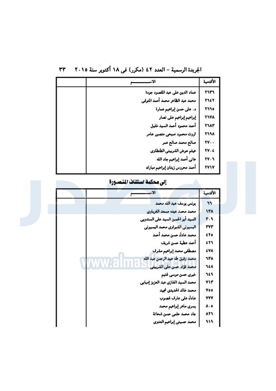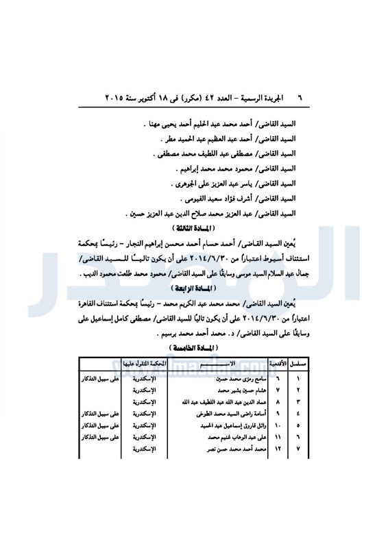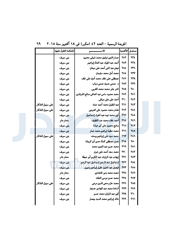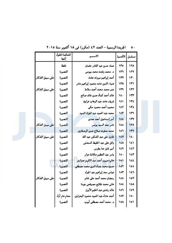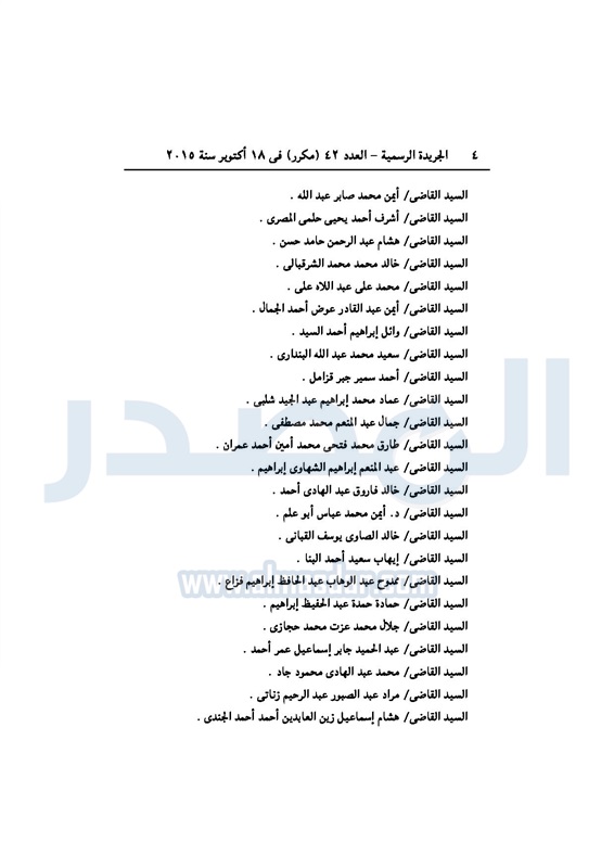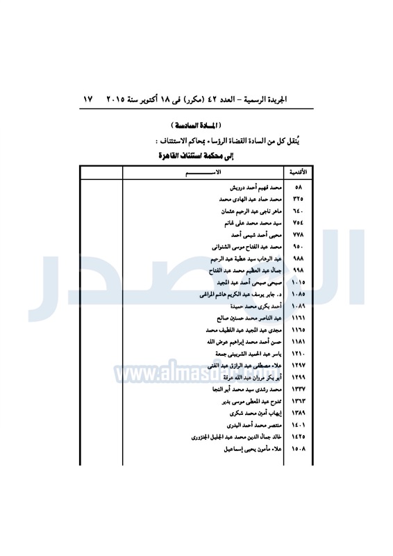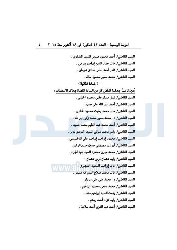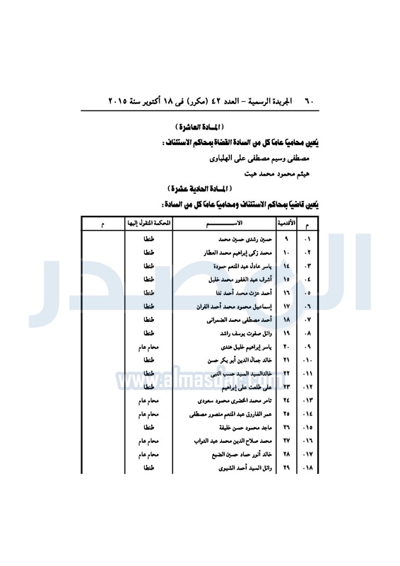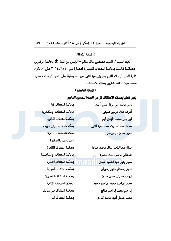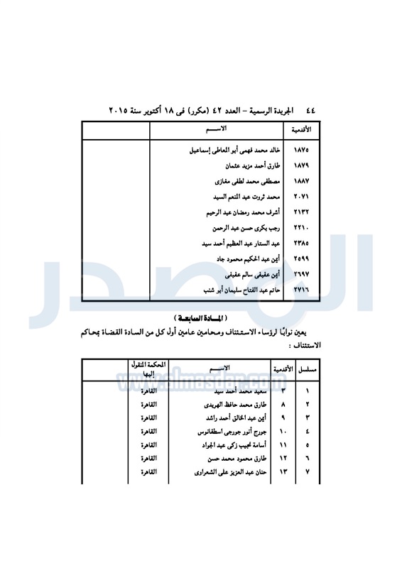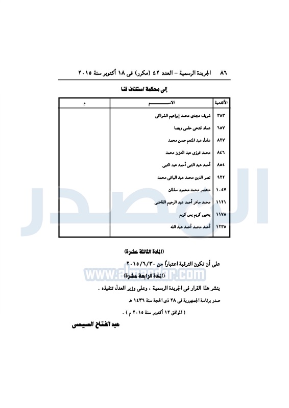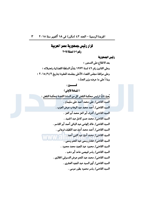 أخبار مصر الرئيس يعين عددًا من القضاة نوابًا لرئيس محكمة النقض الإثنين 19 أكتوبر 2015 - 03:57 م 10/19/2015 3:57:21 PM الرئيس عبدالفتاح السيسي المصدر - خاص طباعة شارك نشرت الجريدة الرسمية في العدد "42" مكرر الصادر فى 18 أكتوبر 2015، قرار رئيس الجمهورية بتعيين عدد من القضاة في منصب نائب رئيس محكمة النقض، وجاء نص القرار كالتالي: طباعة شارك قرار جمهورى الين العين الجريدة الرسمية 2015 تابع المصدر علي جوجل نيوز تطبيق نبض