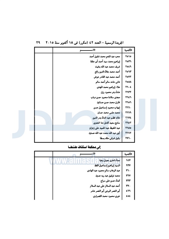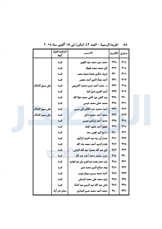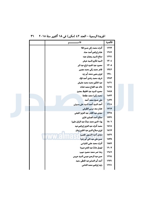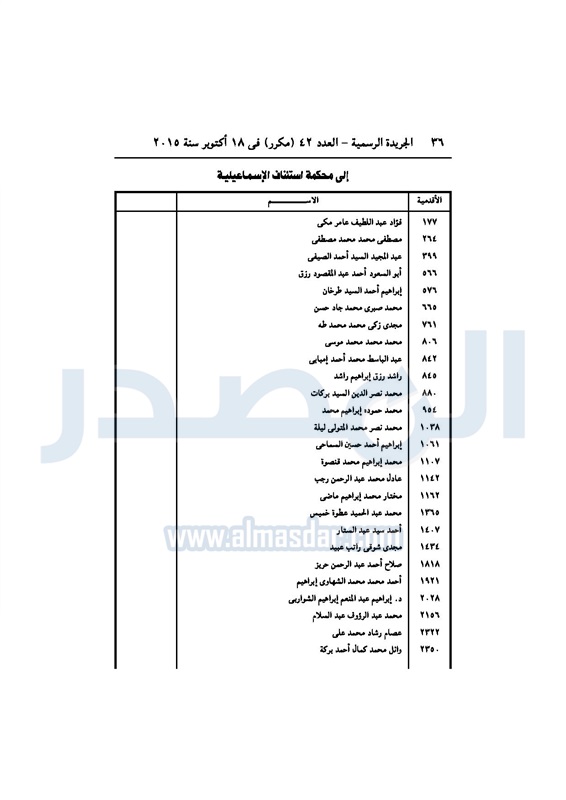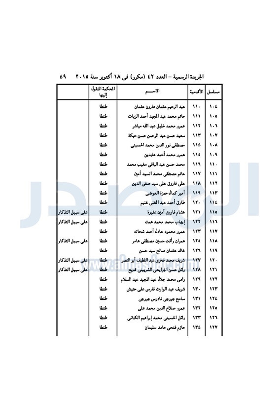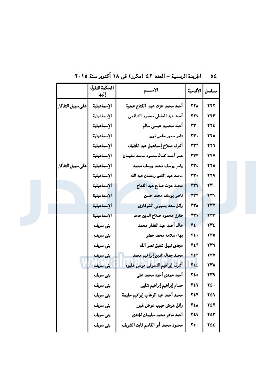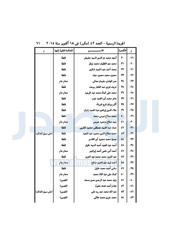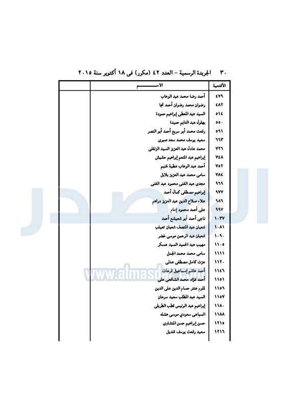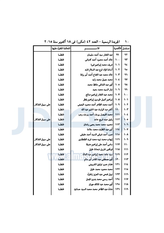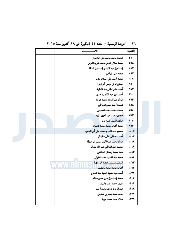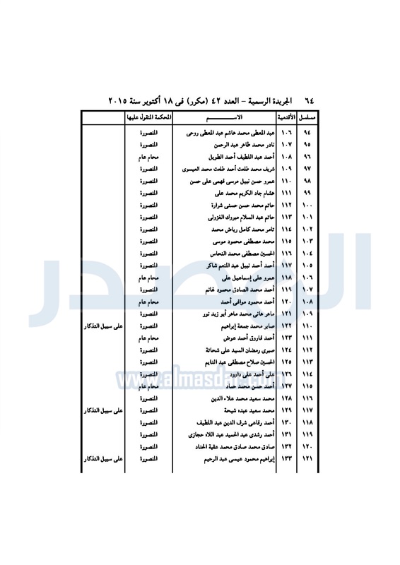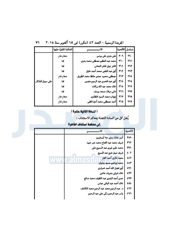 أخبار مصر الرئيس يعين عددًا من القضاة نوابًا لرئيس محكمة النقض الإثنين 19 أكتوبر 2015 - 03:57 م 10/19/2015 3:57:21 PM الرئيس عبدالفتاح السيسي المصدر - خاص طباعة شارك نشرت الجريدة الرسمية في العدد "42" مكرر الصادر فى 18 أكتوبر 2015، قرار رئيس الجمهورية بتعيين عدد من القضاة في منصب نائب رئيس محكمة النقض، وجاء نص القرار كالتالي: طباعة شارك قرار جمهورى الين العين الجريدة الرسمية 2015 تابع المصدر علي جوجل نيوز تطبيق نبض