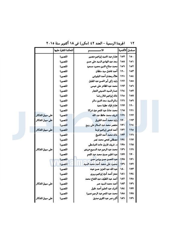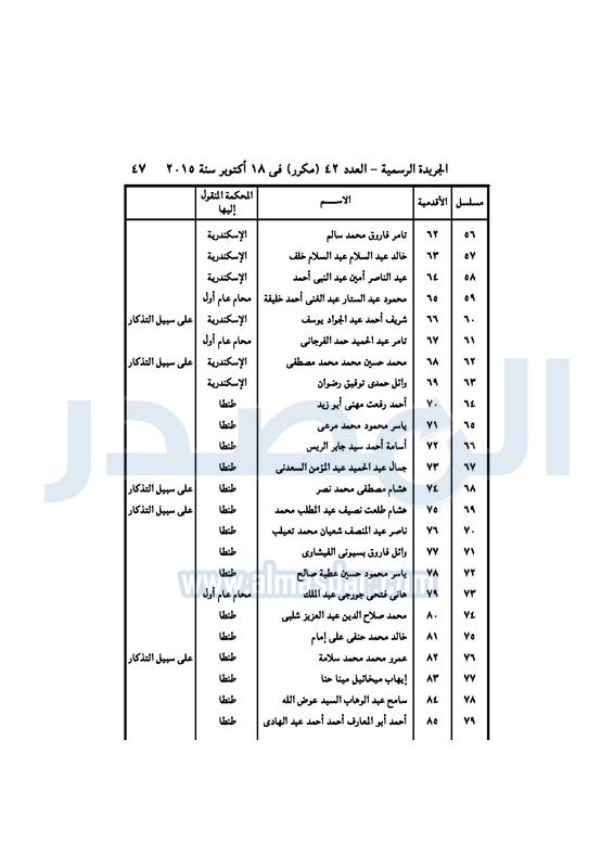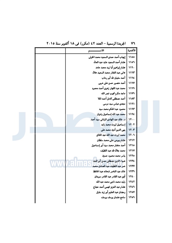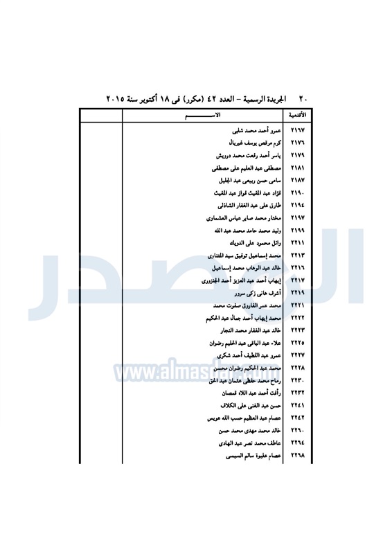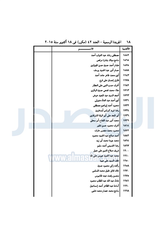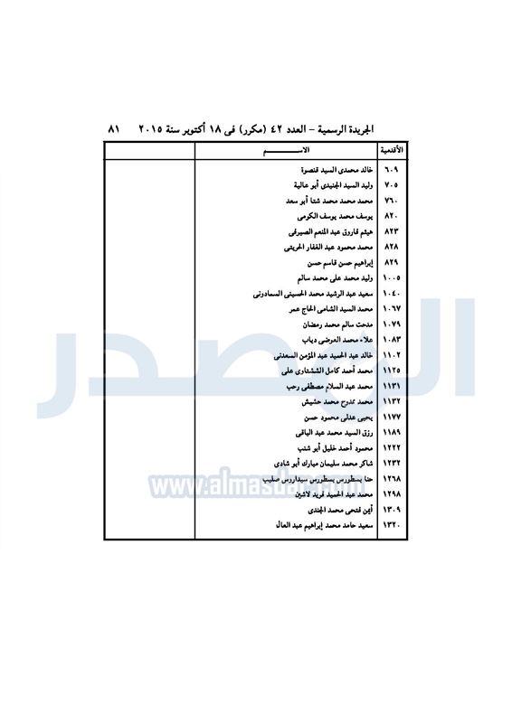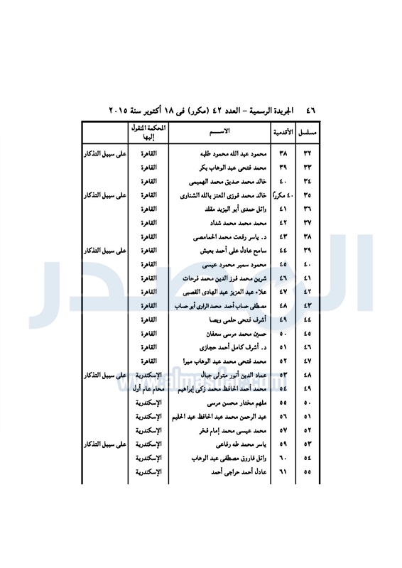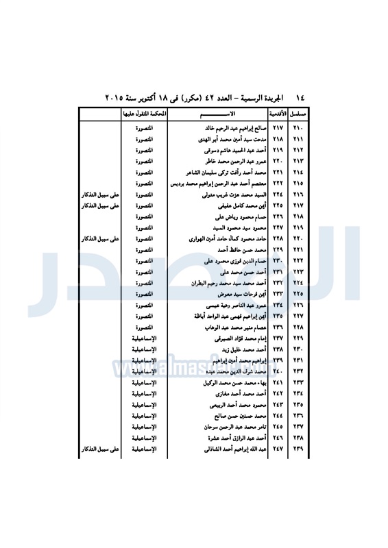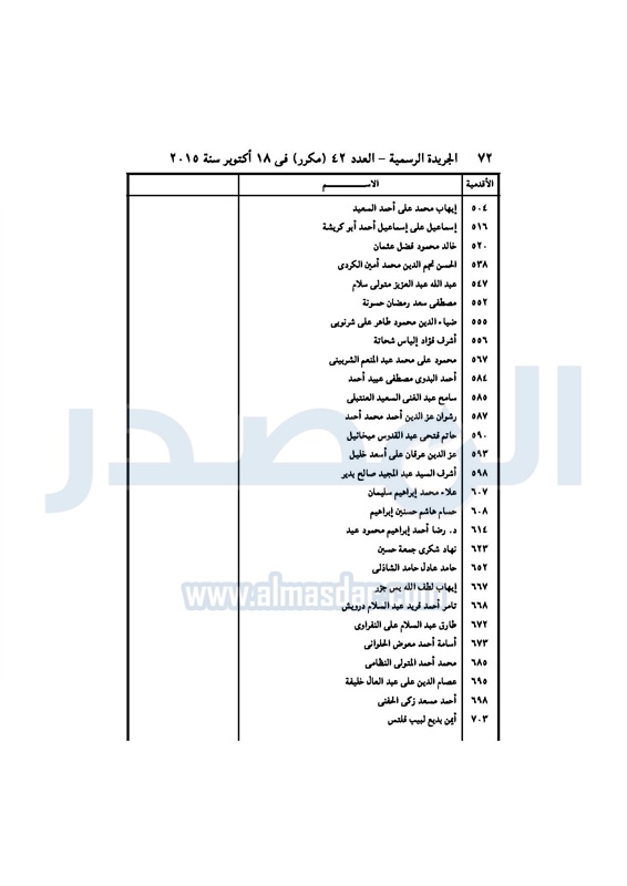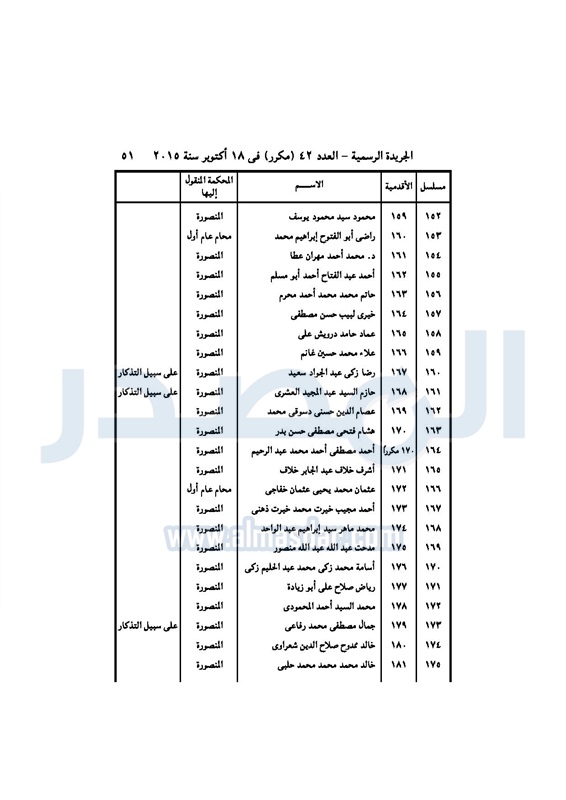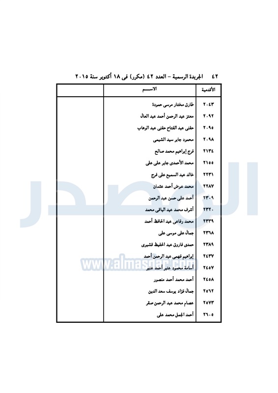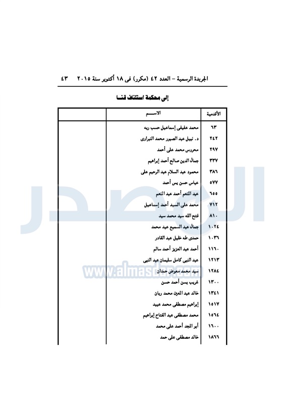أخبار مصر الرئيس يعين عددًا من القضاة نوابًا لرئيس محكمة النقض الإثنين 19 أكتوبر 2015 - 03:57 م 10/19/2015 3:57:21 PM الرئيس عبدالفتاح السيسي المصدر - خاص طباعة شارك نشرت الجريدة الرسمية في العدد "42" مكرر الصادر فى 18 أكتوبر 2015، قرار رئيس الجمهورية بتعيين عدد من القضاة في منصب نائب رئيس محكمة النقض، وجاء نص القرار كالتالي: طباعة شارك قرار جمهورى الين العين الجريدة الرسمية 2015 تابع المصدر علي جوجل نيوز تطبيق نبض