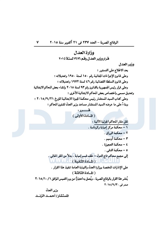 نشرت الوقائع المصرية في العدد "237" الصادر فى 21 أكتوبر 2015 قراراً لوزير العدل بشأن نقل انعقاد مقار 5 محاكم جزئية إلى مجمع محاكم تاج الدول خلف قسم إمبابة، وجاء نص القرار كالتالى:
