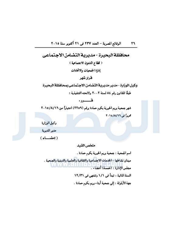 محافظات "التضامن الاجتماعي" بالبحيرة تقرر إشهار جمعية "بريم" الخيرية الأربعاء 21 أكتوبر 2015 - 01:34 م 10/21/2015 1:34:12 PM صورة ارشيفية المصدر - خاص طباعة شارك نشرت الوقائع المصرية في العدد "237" الصادر فى 21 أكتوبر 2015، قرار وكيل وزارة التضامن الاجتماعي بالبحيرة، بشأن إشهار جمعية "بريم" الخيرية بكوم حمادة، وجاء نص القرار كالتالي: طباعة شارك تابع المصدر علي جوجل نيوز تطبيق نبض