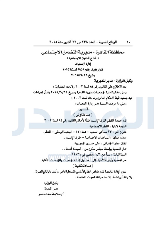 أخبار مصر "التضامن الاجتماعي" بالقاهرة تقرر قيد جمعية "المقطم" لحقوق الإنسان الخميس 22 أكتوبر 2015 - 12:02 م 10/22/2015 12:02:36 PM صورة ارشيفية المصدر - خاص طباعة شارك نشرت الوقائع المصرية في العدد "238" الصادر فى 22 أكتوبر 2015، قرار وكيل وزارة التضامن الاجتماعي بالقاهرة، بشأن قيد جمعية "المقطم" لحقوق الإنسان، وجاء نص القرار كالتالي: طباعة شارك تابع المصدر علي جوجل نيوز تطبيق نبض