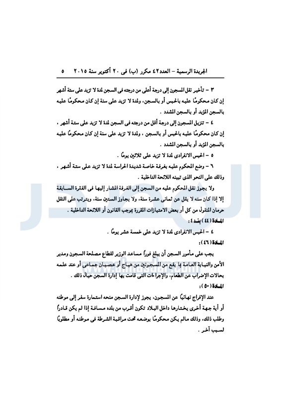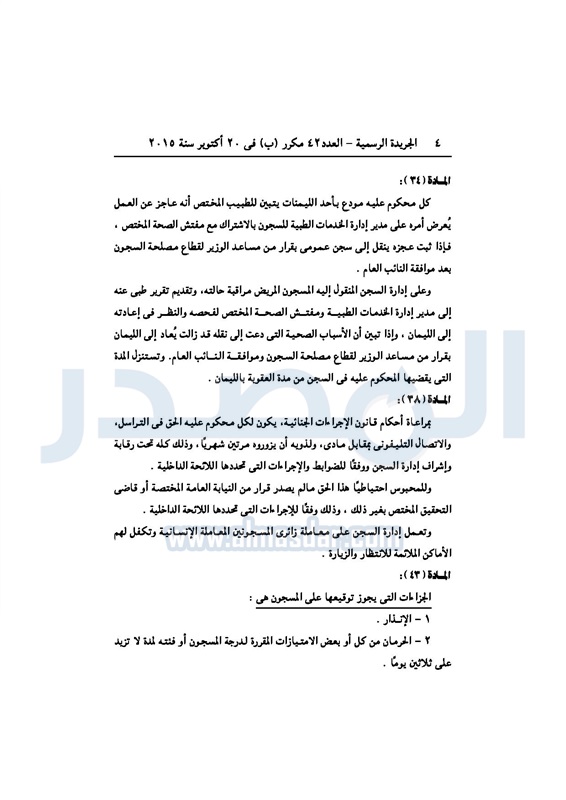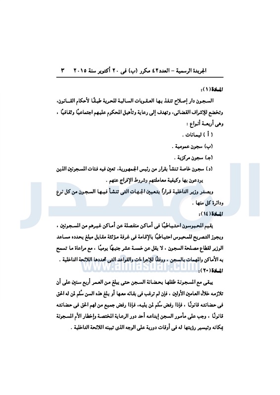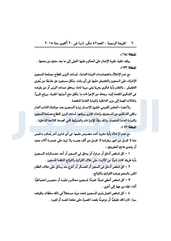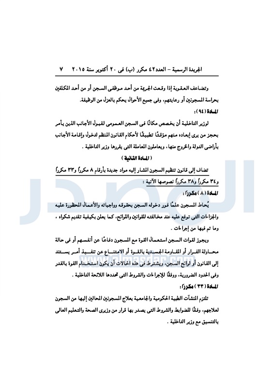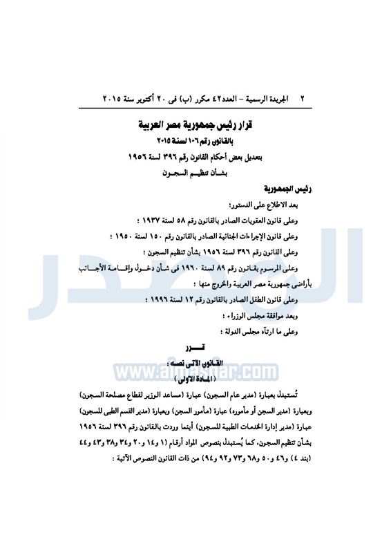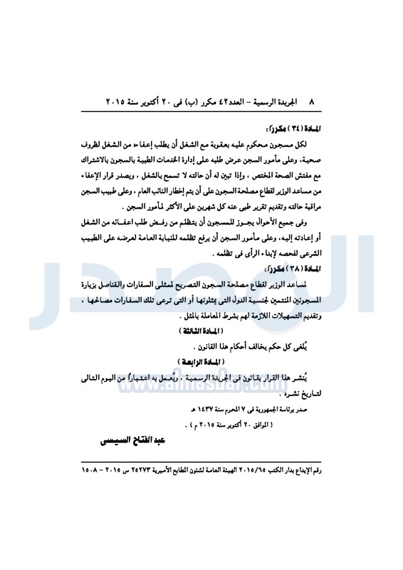 أخبار مصر "السيسى" يصدر قرارا بتعديل أحكام قانون تنظيم السجون الأحد 25 أكتوبر 2015 - 08:32 م 10/25/2015 8:32:59 PM الرئيس عبدالفتاح السيسي المصدر - خاص طباعة شارك نشرت الجريدة الرسميةفى العدد 42 مكرر"ب" الصادر فى 20أكتوبر 2015 ،قراراً للرئيس عبد الفتاح السيسى بتعديل بعض أحكام القانون رقم 396 لسنة 1956 بشأن تنظيم السجون ، للإطلاع على القرار : طباعة شارك تابع المصدر علي جوجل نيوز تطبيق نبض