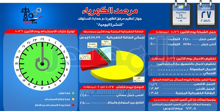 ونوه المركز القومي للتحكم في الطاقة بأن مؤشر حالة الحمل ظهر اليوم الثلاثاء باللون الأخضر منذ منتصف الليل وبداية اليوم حتى العاشرة صباحاً.