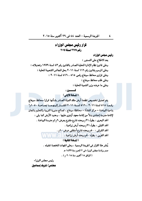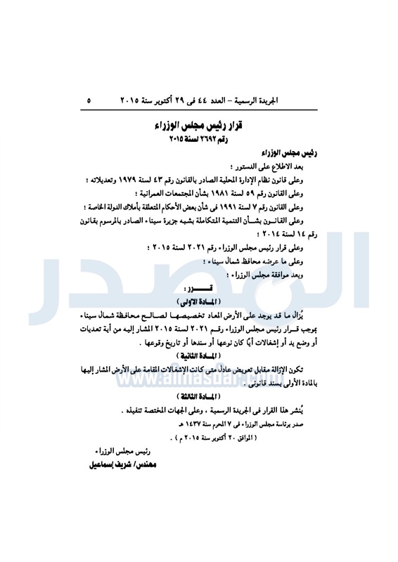 نشرت الجريدة الرسمية في العدد رقم 44 الصادر اليوم الموافق 29 أكتوبر، قرار رئيس مجلس الوزراء، رقم 2645 لسنة 2015 بتعديل القرار رقم 1684 لسنة 2014 المتضمن تخصيص قطعة أرض أملاك دولة بمساحة 90 متر مربع بقرية كفر الغاب بمحافظ دمياط لتكون المساحة 93.5 متر مربع بالمجان لإقامة مجمع مصالح على أن يخصص الدور الأول بمقابل انتفاع لإقامة مكتب بريد، وجاء نص القرار كالتالي: