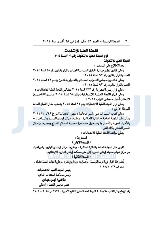 نشرت الجريدة الرسمية في العدد رقم 44 الصادر اليوم الموافق 29 أكتوبر، قرار رئيس اللجنة العليا للانتخابات بنقل مقر اللجنة العامة بالدائرة العاشرة في البحيرة ومقرها إيتاي البارود وشبراخيت من مركز شباب إيتاي البارود إلى محكمة إيتاي البارود، وجاء نصر القرار كالتالي: