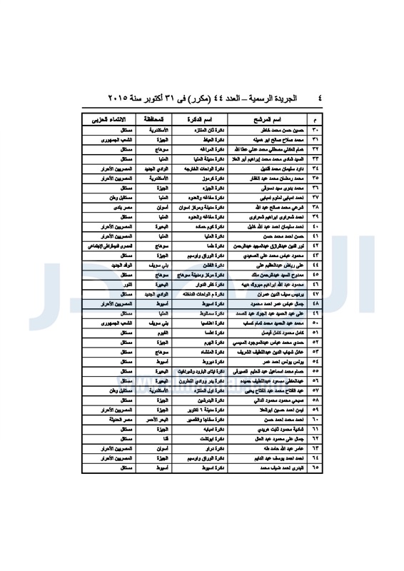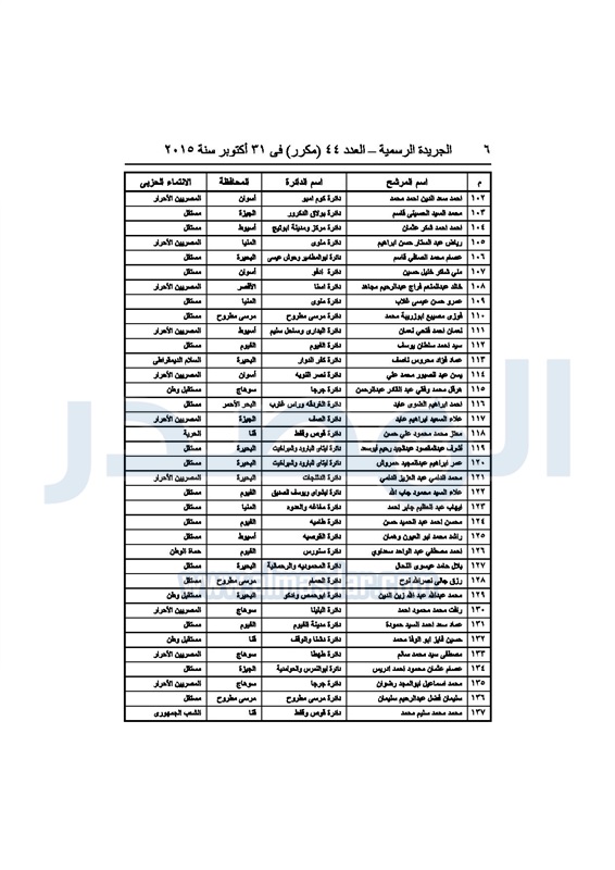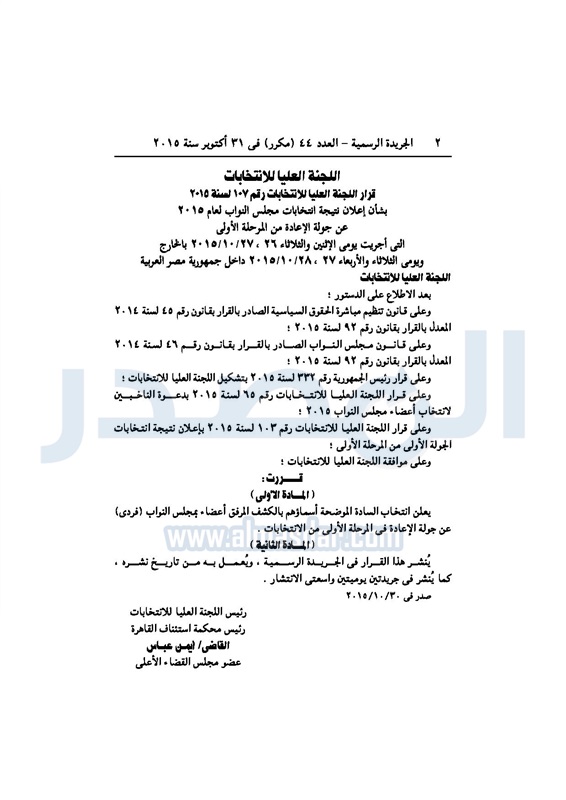 نشرت الجريدة الرسمية في العدد رقم 44 الصادر اليوم الموافق 31 أكتوبر 2015، قرار اللجنة العليا للانتخابات بإعلان المرشحين الفائزين في جولة الإعادة للمرحلة الاولى من الانتخابات البرلمانية كنواب رسميين لمجلس النواب المقبل، وجاء نص القرار كالتالي: