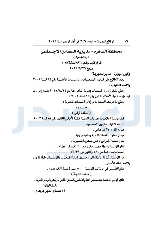 أخبار مصر "التضامن الاجتماعي" تقرر قيد مؤسسة"إعلاميات مصريات" للتنمية الأحد 01 نوفمبر 2015 - 01:11 م 11/1/2015 1:11:36 PM صورة ارشيفية المصدر - خاص طباعة شارك نشرت الوقائع المصرية في العدد "246" الصادر فى 1 نوفمبر2015، قرار وكيل وزارة التضامن الاجتماعي بالقاهرة، بشأن قيد مؤسسة إعلاميات مصريات للتنمية، وجاء نص القرار كالتالي: طباعة شارك تابع المصدر علي جوجل نيوز تطبيق نبض