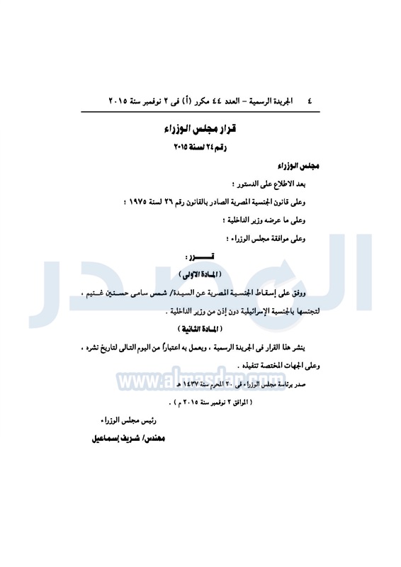 نشرت الجريدة الرسمية فى العدد 44 مكرر"أ" الصادر فى 2 نوفمبر 2015 قراراً لرئيس الوزراء بإسقاط الجنسية المصرية عن السيدة / شمس سامى حسنين غنيم لتجنسها بالجنسية الإسرائيلية دون إذن من وزيرالداخلية .