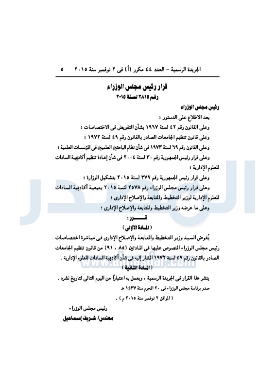 نشرت الجريدة الرسمية فى العدد 44 مكرر"أ" الصادر فى 2 نوفمبر 2015 قراراً لرئيس الوزراء بتفويض وزير التخطيط و المتابعة والإصلاح الإدارى فى مباشرة إختصاصات رئيس الوزراء من قانون تنظيم الجامعات فى شأن أكاديمية السادات للعلوم الإدارية .