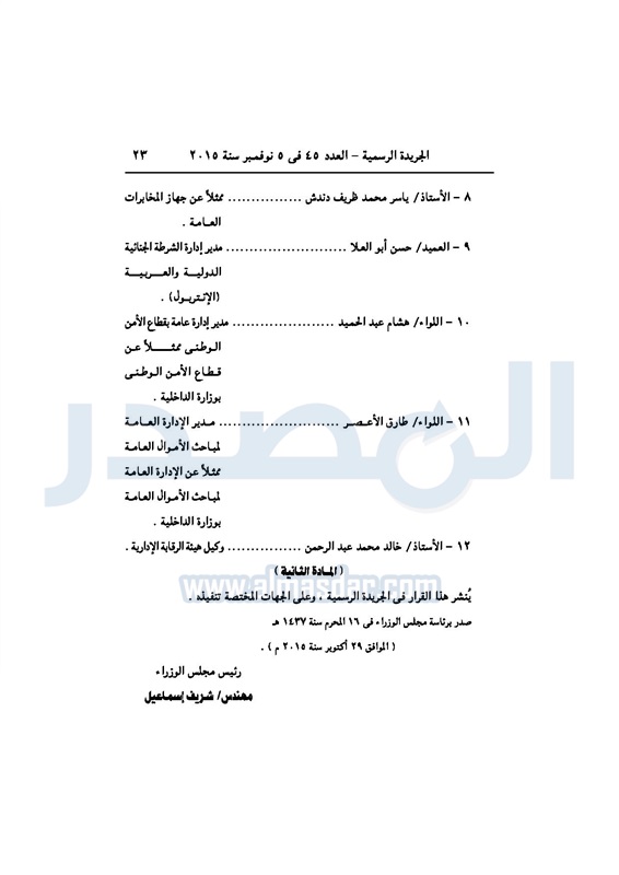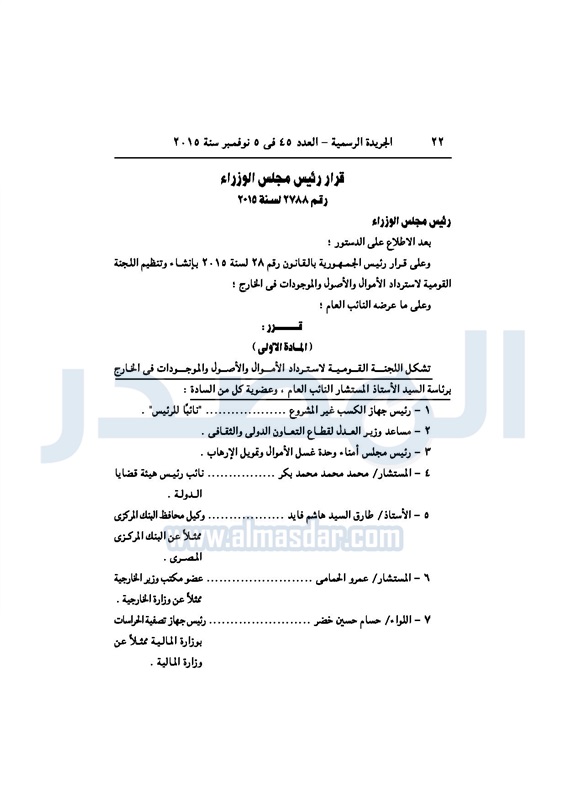 نشرت "الجريدة الرسمية " فى العدد 45 الصادر فى 5 نوفمير 2015 قرار لرئيس الوزراء حول تشكيل اللجنة القومية لإسترداد الأموال والأصول والموجودات فى الخارج برئاسة النائب العام .